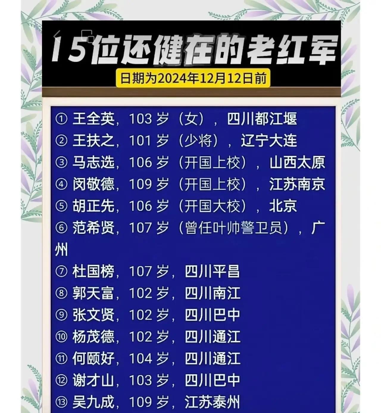 说到长征老红军,全国只剩下三位,他们分别是107岁的胡正先、104岁的马志选,还有102岁的王扶之。 看着这些数字,心里不禁咯噔一下。那些曾经爬雪山过草地的英雄们,如今只剩下三位百岁老人见证着我们这个时代。他们每一个都是活的历史教科书,身上承载着几乎一个世纪的革命记忆与民族精神。 胡正先老人已经107岁高龄了,这位被称为“红色听风者”的老红军,12岁就参加了革命。1930年加入红军时,他还是个14岁的少年。 在总部通讯局工作期间,他用电台捕捉机密情报,在解放战争的三大战役中立下赫赫战功。 直到最近,108岁的他还亲口回忆起在炉霍的岁月:“那时的炉霍,战士们白天帮藏族老乡春耕,晚上就着酥油灯为二六军团的战友织毛衣。” 马志选老人今年104岁,1932年12月参加红军时也只有14岁。1938年加入中国共产党,至今党龄已达86年。他经历了长征的全过程,见证了中国共产党和中国人民军队的坚韧不拔和英勇无畏。 王扶之将军是三位中“最年轻”的,102岁。他不仅是目前唯一在世的开国少将,还保持着90年党龄的纪录。从陕西贫困孤儿到开国将军,他的人生堪称传奇。 1935年,刘志丹领导的红军队伍来到他的家乡,这个决定改变了他的一生。今年5月,“平型关大战突击连”的官兵还特意看望了这位亲历平型关大捷的老英雄。 想到2020年全国还有61位老红军健在,2021年减少到54位,而到2023年,只剩下11位。这些数字的变化让人心痛,最年轻的也已百岁高龄。每一位老红军的离去,都像是一本活历史书的闭合,令人产生历史逐渐远去的恐慌感。 这些老红军们身上都有着惊人的毅力与坚定的信念。翻看王全英老人(2025年初已逝世)的故事,她14岁加入红军,翻雪山时左脚被冻伤,脚趾甚至在大雪中冻坏,却依然带着伤痛坚定前行。 从金川到汶川,她走了一年,期间与大部队失散,却拒绝回家,“回家就是死路一条”。 我们不能让这些珍贵的历史记忆随岁月消逝。炉霍县已经开始行动,他们筹建长征国家文化公园,准备打造“红色记忆+非遗体验”的复合型研学线路,让郎卡杰唐卡描绘长征故事,用藏族山歌传唱军民情谊。 这些老红军是我们与那段峥嵘岁月的最后联系。他们不仅仅是历史人物,更是革命精神的化身。每一次与他们的交流,都是对历史的拯救,对精神的传承。 我们应该更加积极地记录他们的口述历史,保护红色遗址,让长征精神在新时代继续发光发热。 随着时间推移,这三位老红军也会离我们而去,但他们所代表的红军精神,坚定不移的信念、艰苦奋斗的作风、无私奉献的品质,将会永远激励着我们前行。这正是中华民族宝贵的精神财富,需要我们代代相传。 各位读者你们怎么看?欢迎在评论区讨论。 国内权威媒体报道信源:中国军网《开国少将王扶之与“平型关大战突击连”官兵的温暖互动》