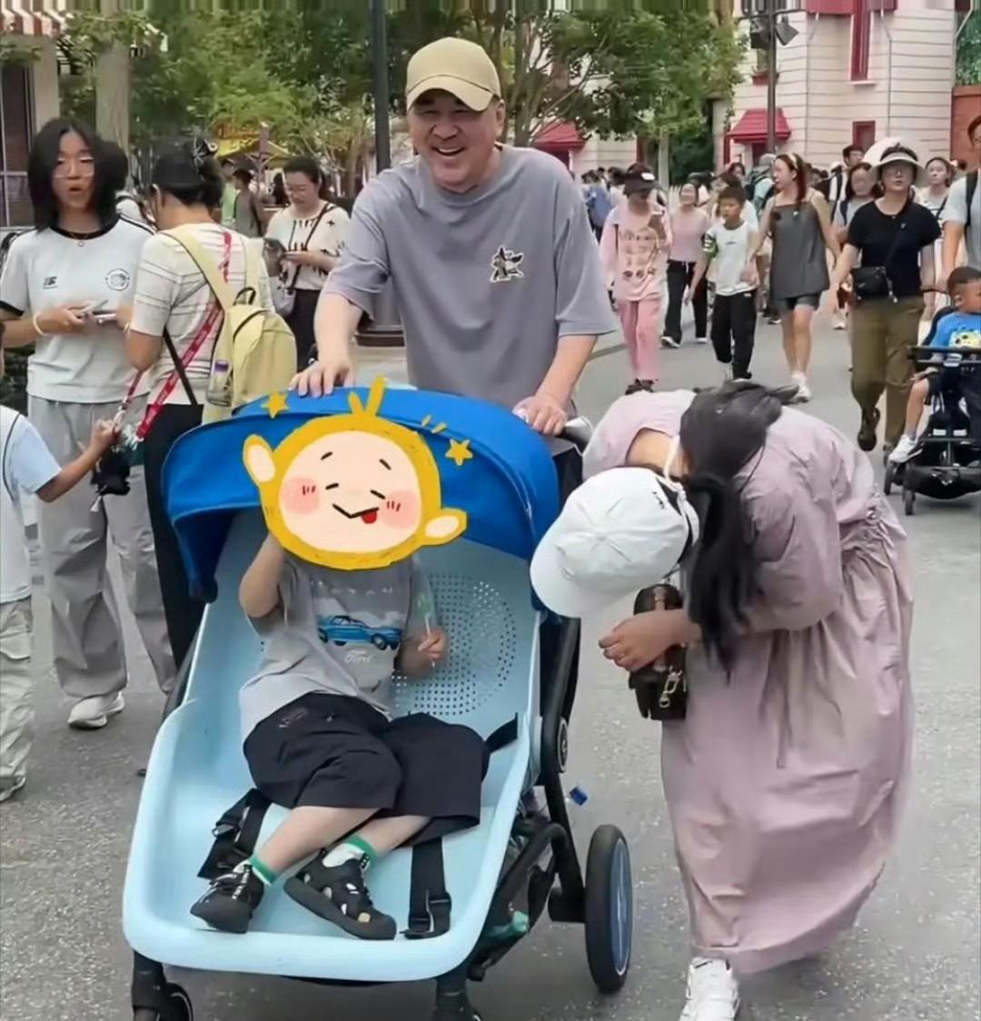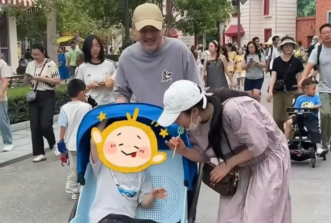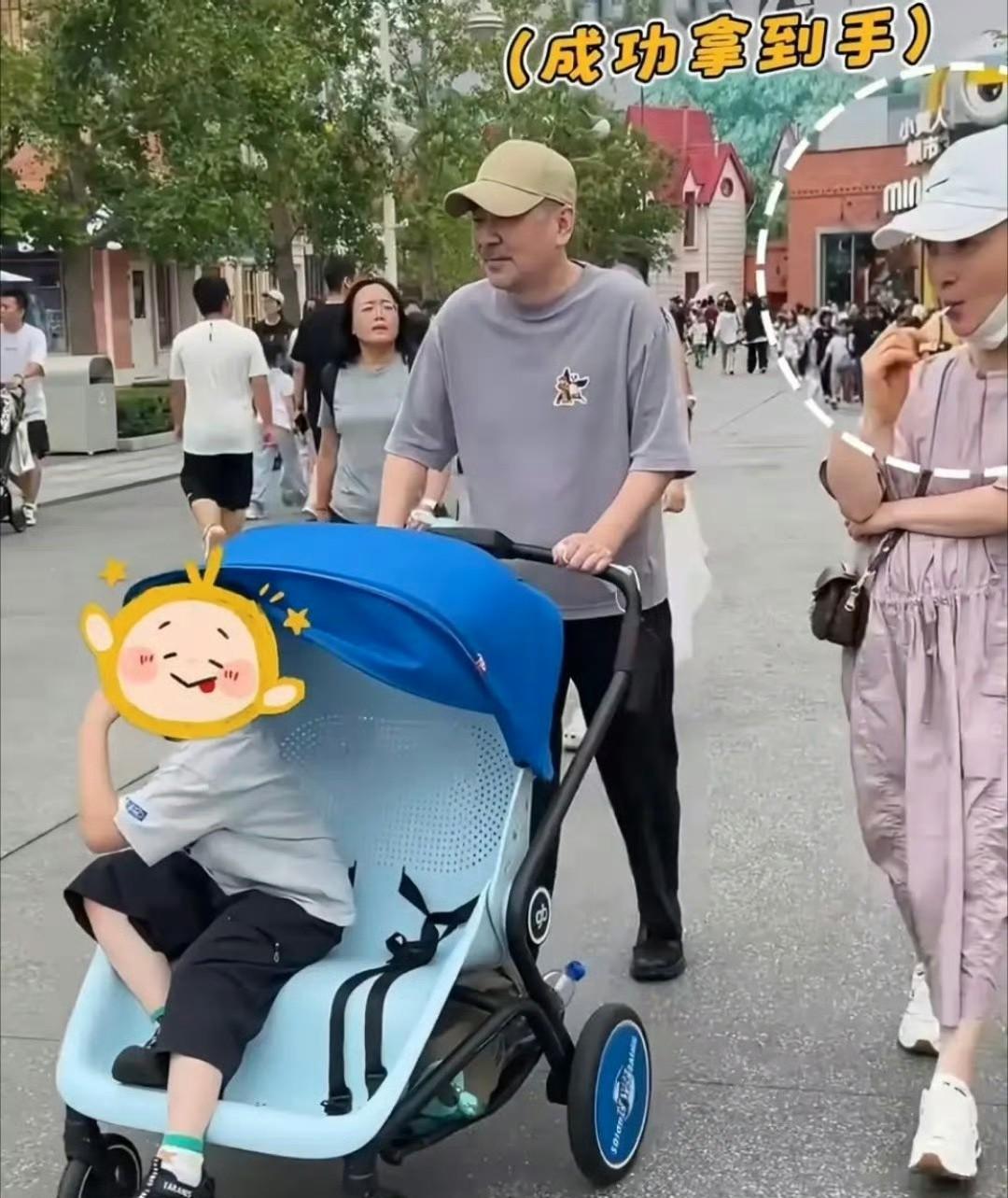 蒋勤勤一家出门玩儿被拍到啦!她背了一只LV的包,另一边陈建斌笑呵呵地用小推车遛7