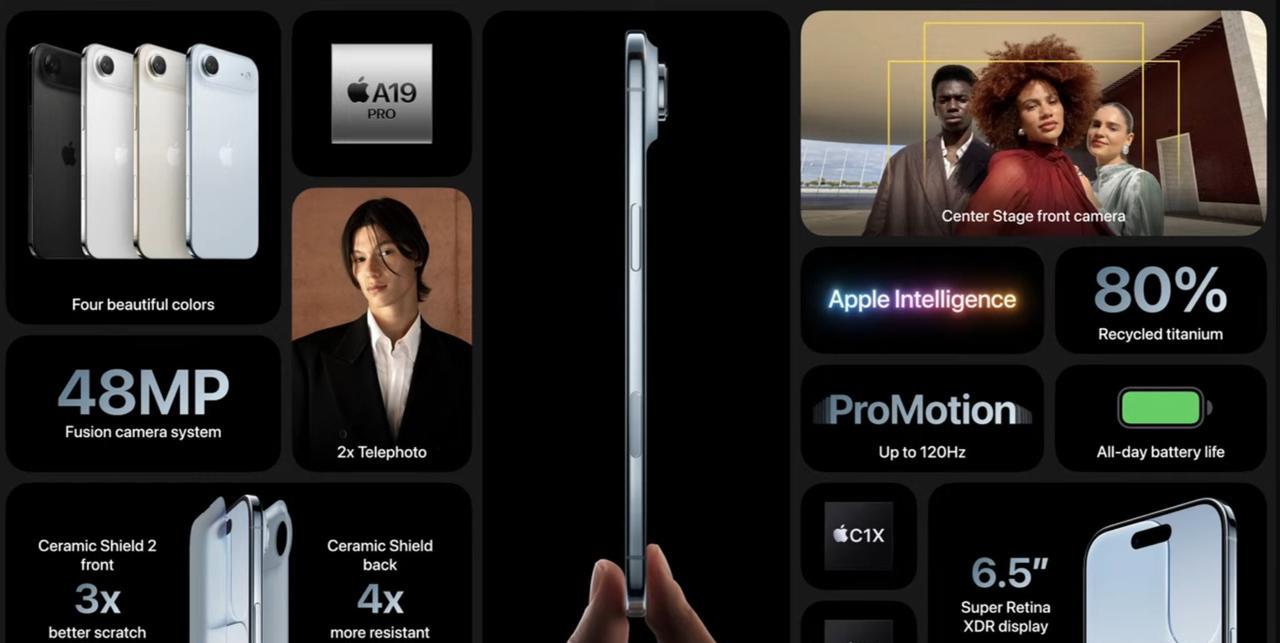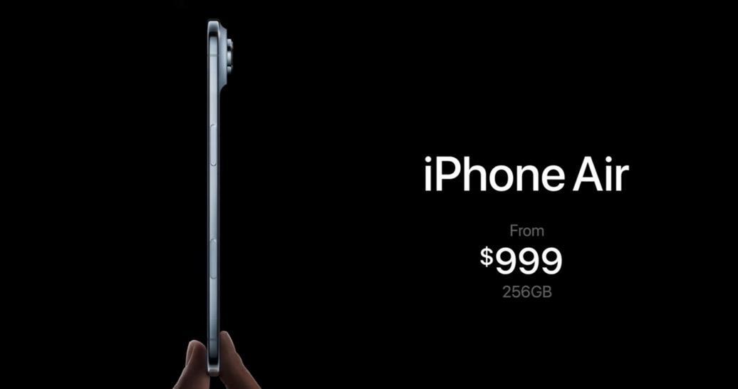 苹果发布第一代iPhone Air(图1-9) iPhone Air 具有双摄像头功能,有四种颜色可选择。售价$999。 -薄5.7毫米 -6.5英寸显示屏,3000尼特 - 正面和背面的陶瓷护盾抗刮擦性能提高 3 倍 - 全新“平台式”相机凸块可容纳所有物品 - 剩余空间被电池占用 - 超强材料 80%再生钛 - 深空黑色、云白色、灰色、天蓝色 -A19 Pro芯片,无线连接 - 全新 N1 芯片、WiFi 7、蓝牙 6 和线程 - 全新 C1X 调制解调器,速度提高 2 倍,更节能 - Air 是迄今为止最节能的 iPhone - 全新 48MP 融合摄像头系统 -与 iPhone 17 相同的新前置摄像头 - 双捕捉视频