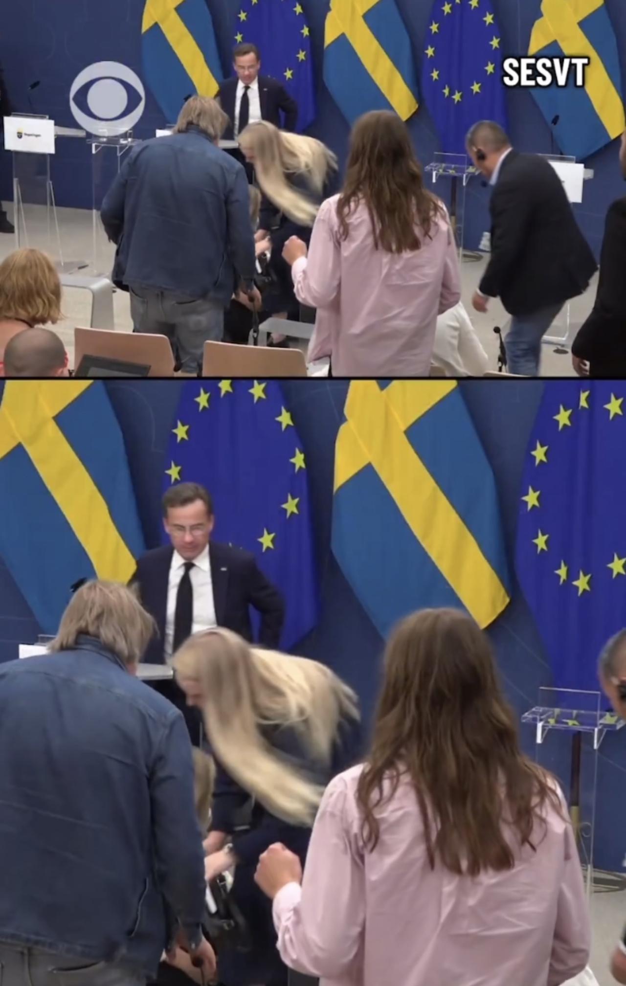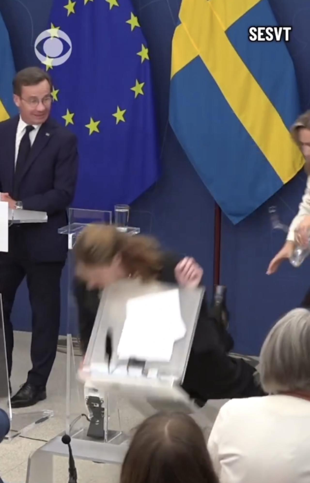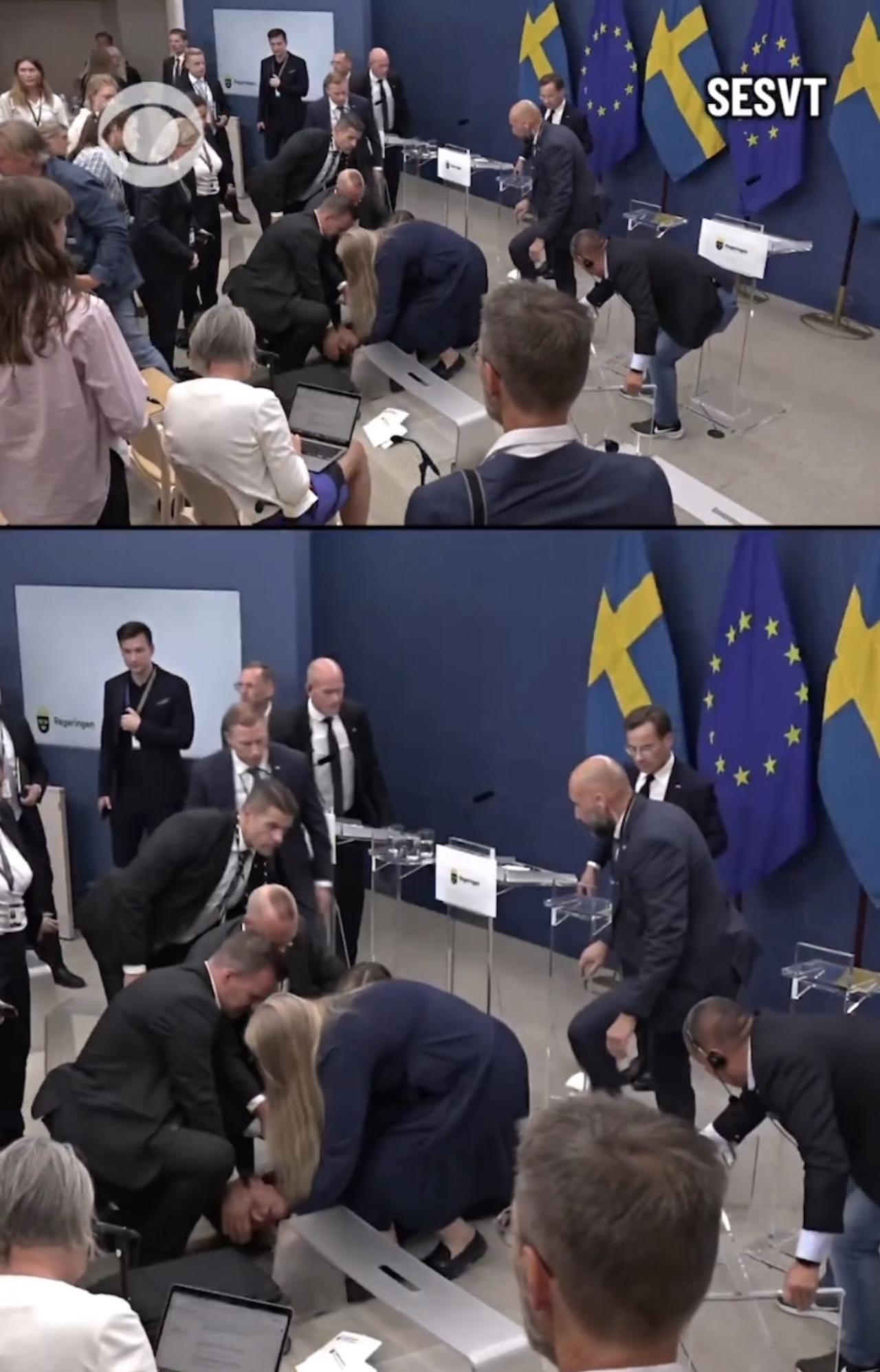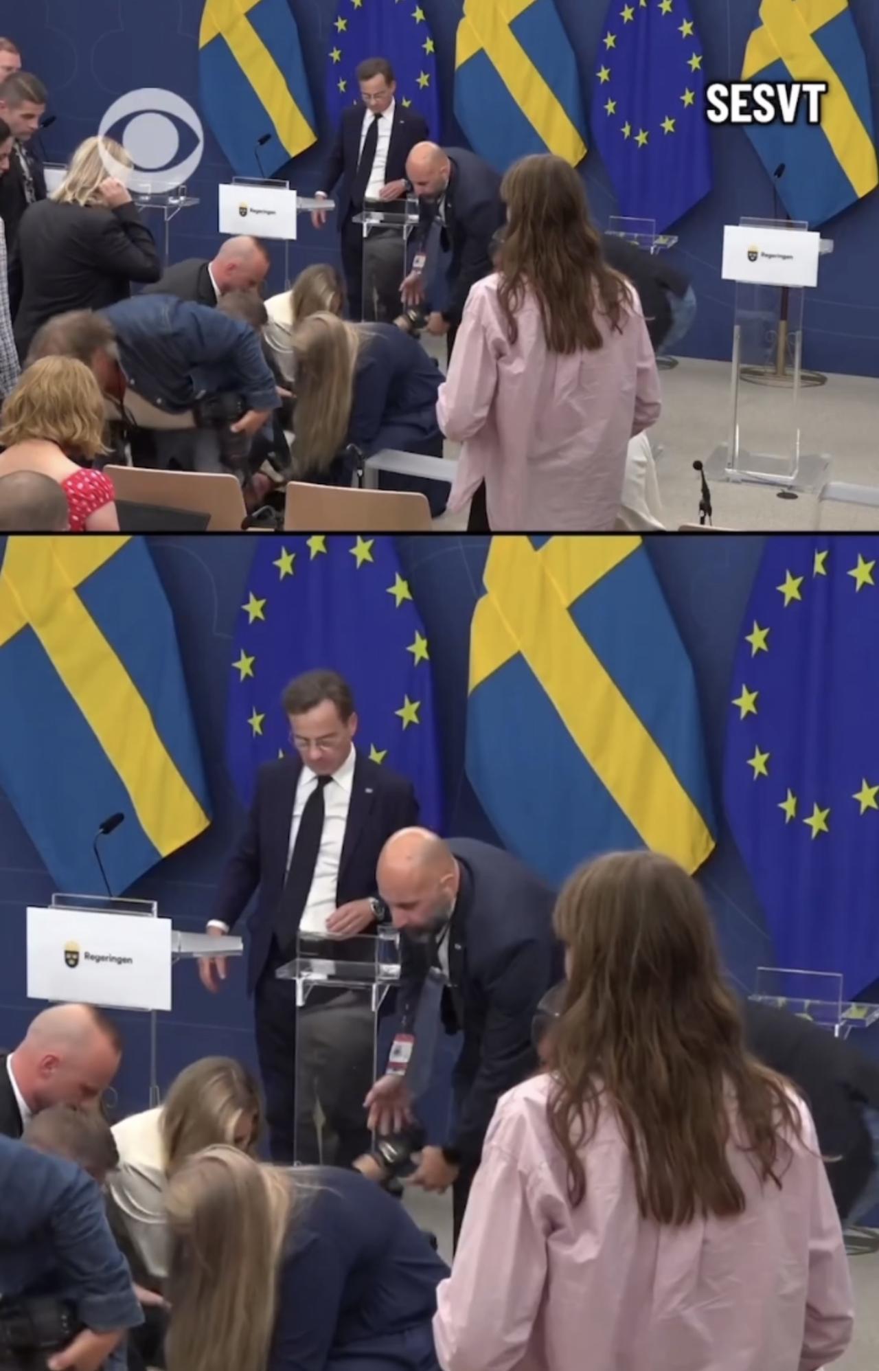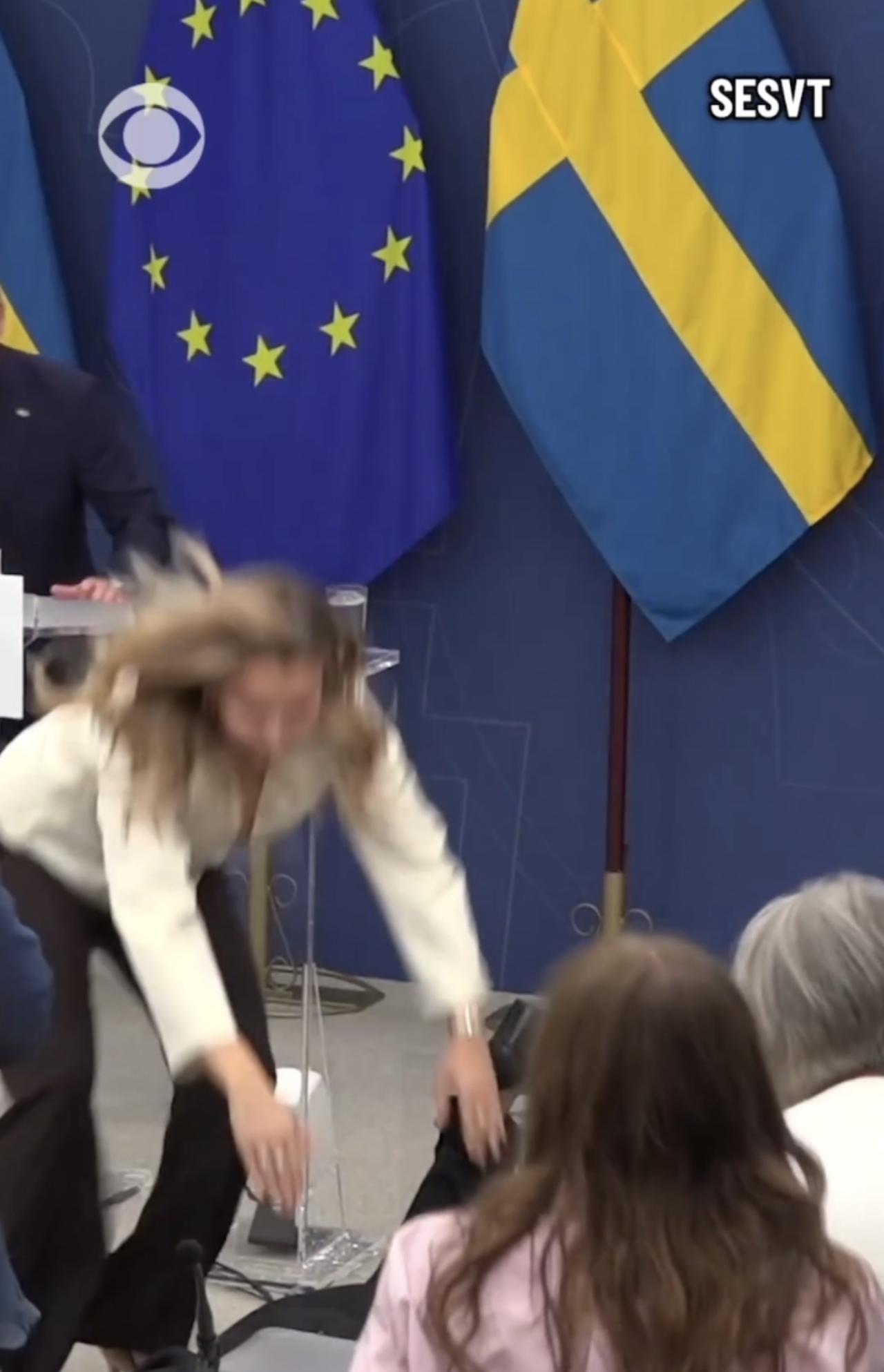 瑞典卫生部长伊丽莎白.兰恩上任第一天,周二在新闻发布会上突然晕倒,身体向前跌倒在
