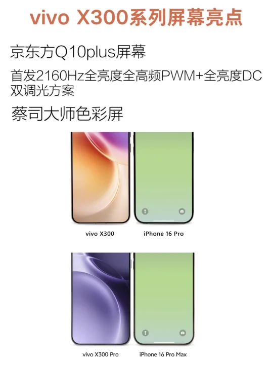 之前安卓大杯总缺个让人动心的直屏,这次vivo带来了更懂果粉的大杯旗舰,一出手就戳中痒点,下面我们一起来看看有哪些升级吧 - vivo X300全系采用直屏设计,标配定制京东方Q10 Plus屏幕,亮度更高,偏色更小,而且更省电 首发2160Hz全亮度全高频PWM+全亮度DC双调光方案,更是熬夜党福音——双调光双保险,对眼睛真的很友好,长时间用眼睛也不酸 👉🏻而且X300系列都是果味大R角,采用lipo技术,边框更窄更圆润,X300的边框也是🔥蓝厂史上最窄的边框‼️甚至比16PM边框还要窄~ 所以说这次vivo X300系列的屏幕没毛病吧?可能2025好屏幕非它莫属了 以前换安卓手机总要在「喜欢的直屏」和 「旗舰配置」 里妥协,这次 X300 系列直接把X系列 Pro 版直屏空填上,还把窄边、护眼都做齐了,果粉换安卓终于不用将就啦! -