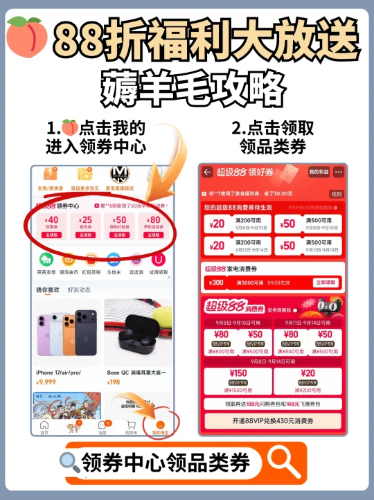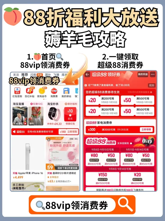 家人们🍑超级省钱的攻略来了! ✅领券路径超简单👉🍑【🔍88vip】领消费券🍑【🔍领券中心】领取品类券🧧立减叠券7.9折起这波88活动真的太香了!不管是自己用还是给囤货,闭眼薅就完事儿!赶紧码住攻略,手慢无啊家人们!