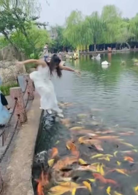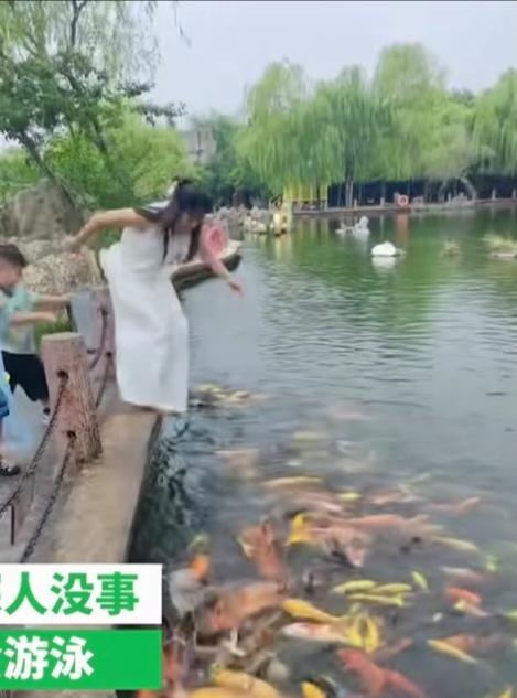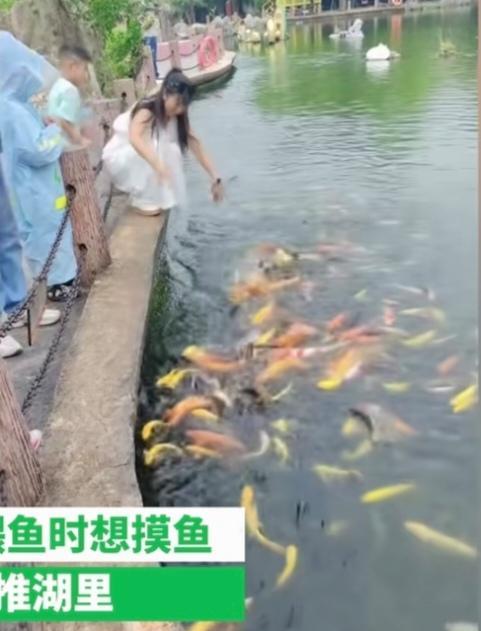 9月4号,亳州一女子带六岁的儿子到公园里去游玩,看到湖边水中聚集着许多红色和金色的金鱼,女子走到岸边,跨过围栏,想摸摸金鱼。