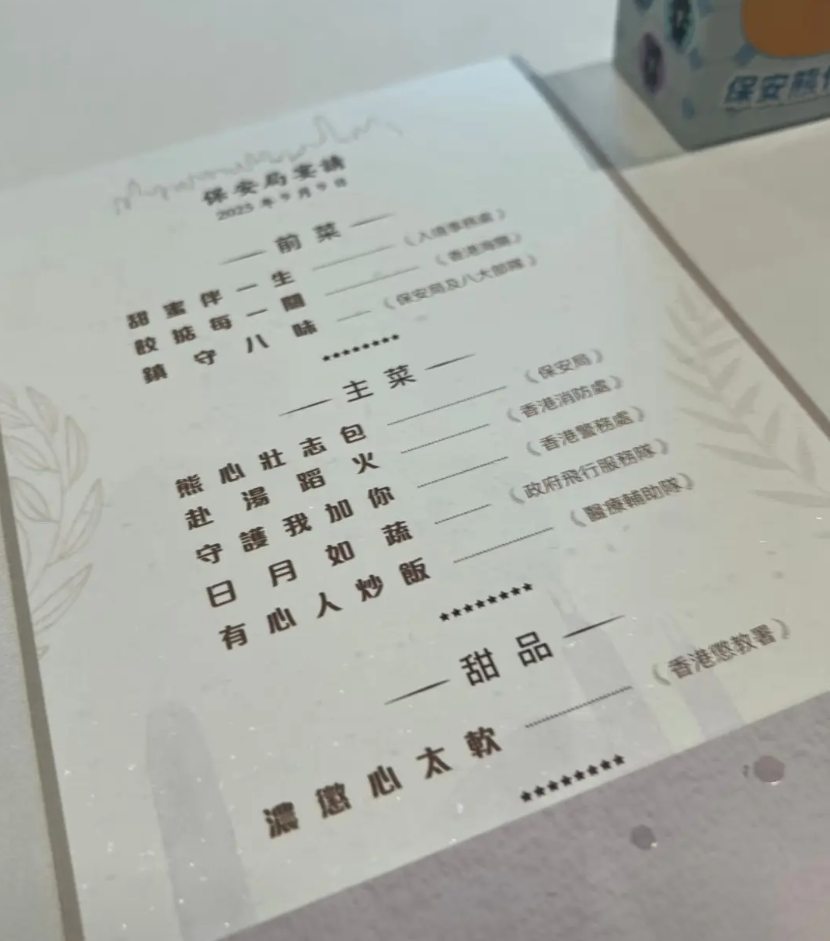 9月9日,香港保安局宴请几位TVB影视剧中的著名卧底,有《使徒行者》中天堂哥,kobe,《学警狙击》中Laughing哥。菜品名特别有意思,例如前菜“甜蜜伴一生”指入境事务处。 TVB可以把以往著名卧底单列出来拍个故事,把人物都连起来,用情怀换收视。