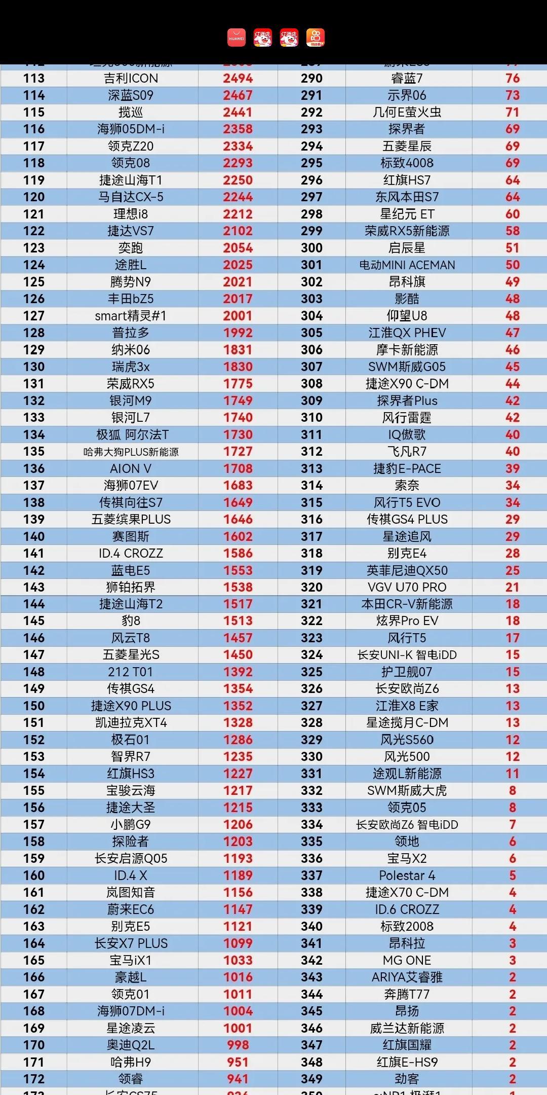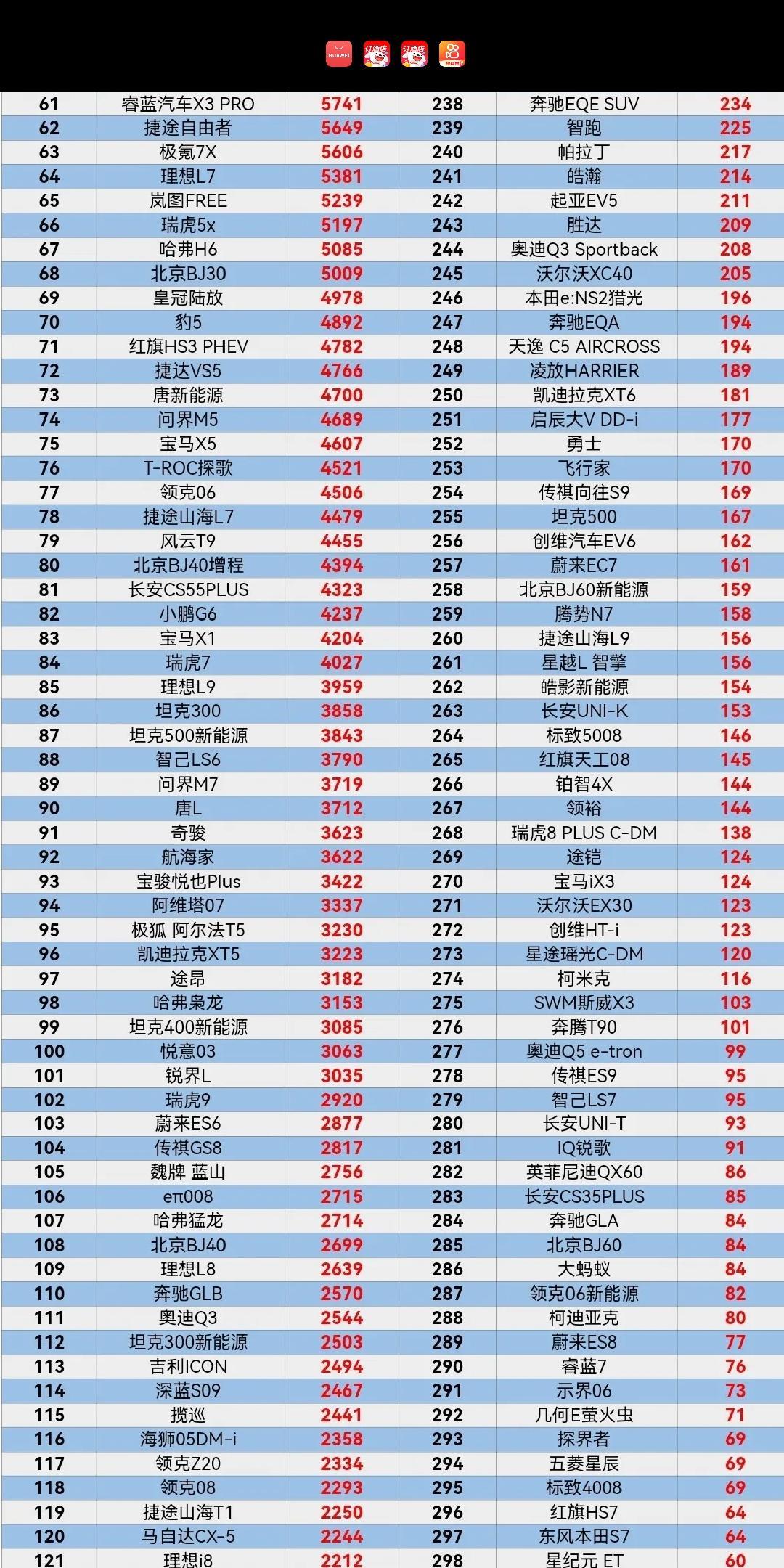 8月份的Suv销量排名。荣放第六。CRV第17。威兰达第24名。汉兰达53,逍客56。陆放69!H6排67。宝马X1,83名。