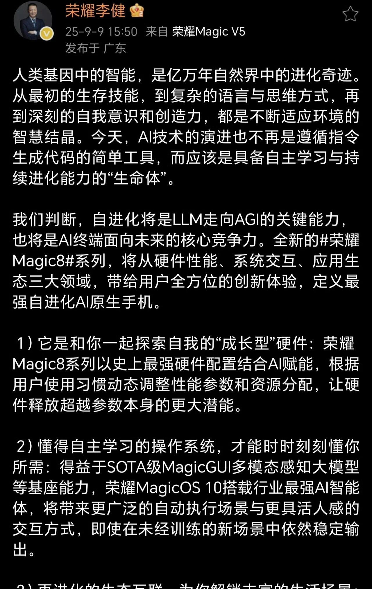 刚刚荣耀CEO李健官宣Magic8系列,将其定义为“最强自进化AI原生手机”。这