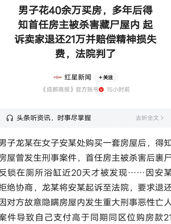 四川巴中,男子花44.5万买了一套房,7年后,得知第一任房主被 杀 藏 尸在房子的厕所里近20天,散发臭气才被人发现,男子觉得卖家故意隐瞒此事,导致自己买的房比同期同地段多花了21万,便告上法院,要求卖家退还自己多付的21万,并赔偿3万精神损失费,法院判决让人意外。