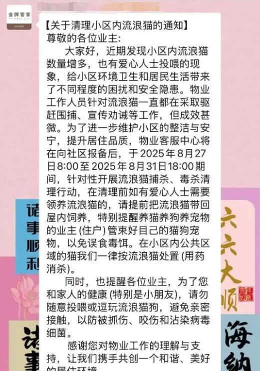 太缺德了!8月26日,四川资阳,一小区物业在业主群内发布通知,为了维护小区内的整洁和安宁,将对小区内的流浪猫展开为期5天的毒杀行动!在此期间,希望各位业主管束好自己的宠物,以免误食毒饵。网友:流浪猫没了,就轮到蛇泛滥了! 如今在很多小区中,都能见到流浪猫狗的身影,一些有爱心的居民会投喂它们,这就导致越来越多的流浪猫狗聚集在小区中。虽然流浪动物会给环境带来一定的影响,但它们也可以捕捉小区内的老鼠、蛇等,因此不能一概而论。 当天,物业突然在群里面发布通知,由于近些时间流浪猫数量的增多,导致小区产生了卫生问题,因此决定采取措施来整治流浪猫,在行动期间,只要是出现在公共区域的猫,一律按照流浪猫处置,因此希望业主们看管好自家的猫咪。 许多业主都被物业发布的通知所震惊,有人赞同,但更多的人反对,事情很快就被人举报给了有关部门,经过慎重考虑,物业还是取消了这次毒杀行动。 取而代之的是积极的处理,物业公司深刻意识到了自己的错误,主动联系了流浪动物救援组织,最终小区内的流浪猫将交给一家宠物医院安置,后续会带回去打疫苗、做绝育等,如果有人想要领养,也可以前往医院办理相关手续。 信息来源:《四川资阳一小区物业拟毒杀流浪猫被叫停,当地回应》封面新闻