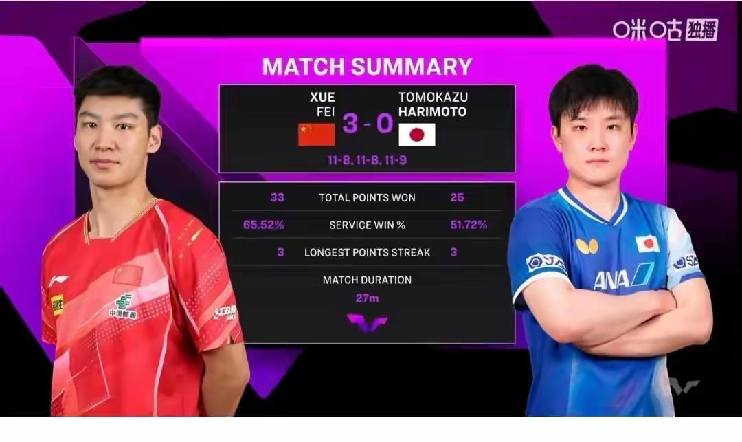 非常棒的内蒙古雄鹰!薛飞3比0,让日本的张本智和一轮游! 打得张本没脾气了,直摇