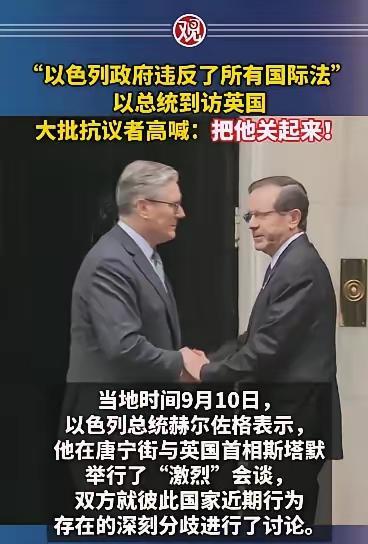 这件事英国做的“很爷们儿”。 按照传统推理,一般情况下,哥们儿的哥们儿,也是哥们儿。 英国和美国的关系,是世界上哥们儿中的铁哥们儿。 而以色列和美国的关系,虽然有一点争论。但范围也就在哥们儿或者爷们儿之间,出不了这个框架的。 但这回英国在一件事上,不但不给小以面子,也没有给大哥面子。 9月10日,为游服英国不要加入承认巴勒斯坦国的行列,以色列总统赫尔佐格到访唐宁街十号。 随后,赫尔佐格与英国首相斯塔默,进行了“激烈”的会谈。 而门外欢迎赫尔佐格的人群格外“别致”。 因为他们大声喊出的口号是“把他关起来!” 信息来源:观察者网。