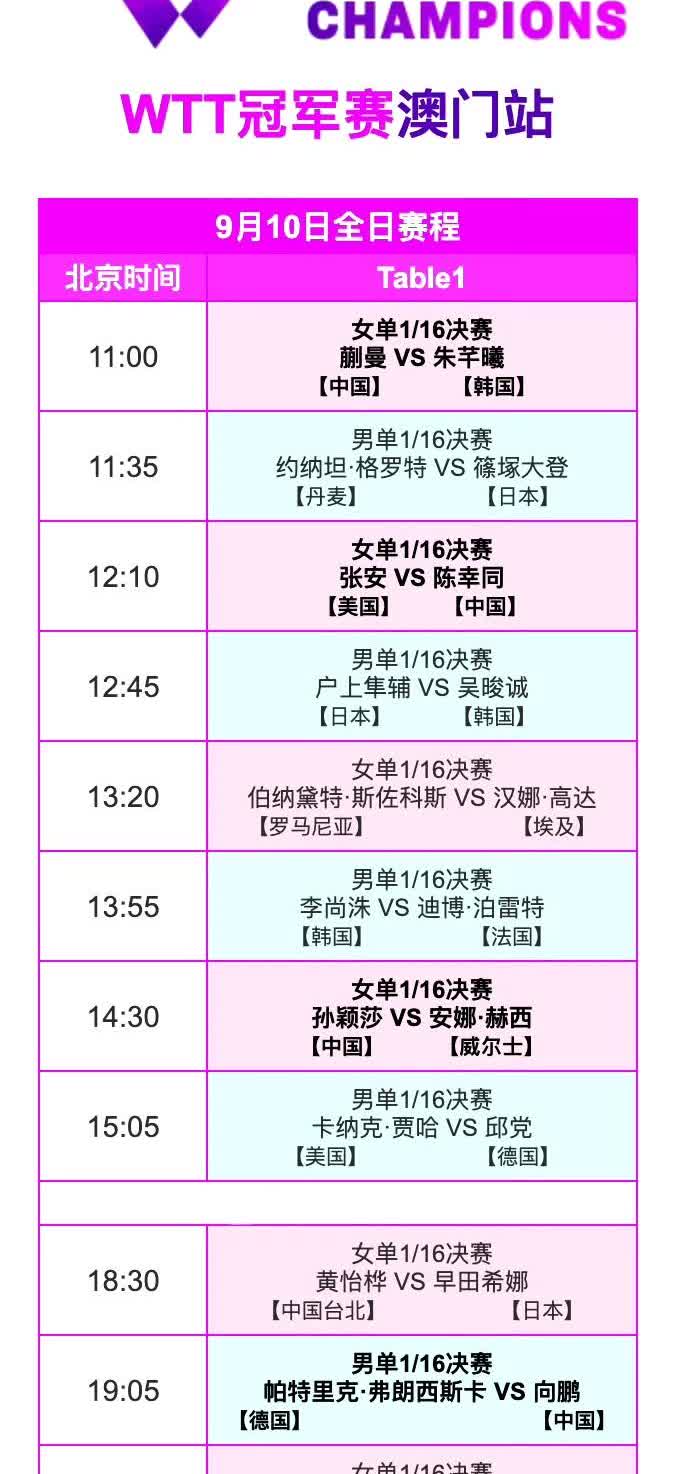 WTT澳门冠军赛9月11日中国队赛程 【1/16决赛】 11:00🇨🇳陈
