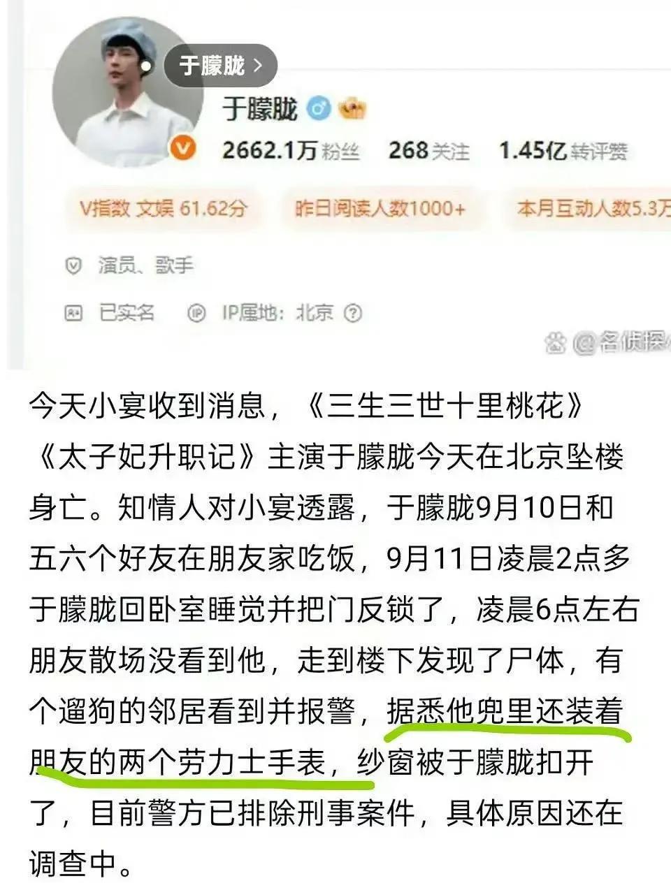 于朦胧坠楼身亡?不是吧! 有狗仔说于朦胧坠楼身亡, 快点出来辟谣吧! 这应该不是真的吧? 怎么会突然坠楼, 吃个饭怎么会坠楼? 今年的明星意外出事的好多啊! 于朦胧虽然这几年有点糊, 但至少有戏拍, 日子过得应该算不错吧? 而且也没有看到关于情绪方面的问题新闻, 总不能说是开窗不小心掉下去了? #于朦胧#