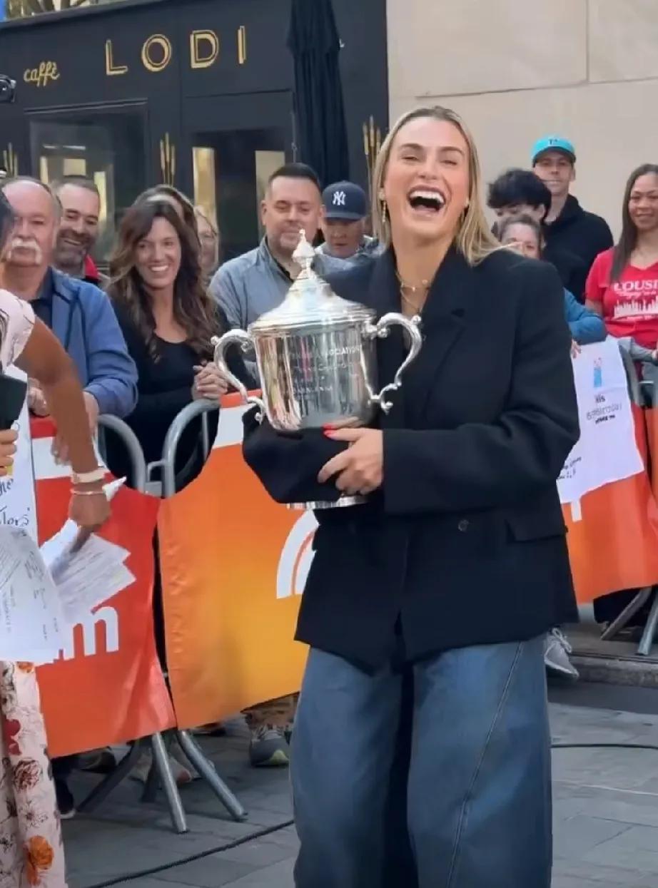被萨巴伦卡和阿卡的互动给逗笑了! 萨巴伦卡在社媒上晒出捧杯照并发文:俺只是一个自
