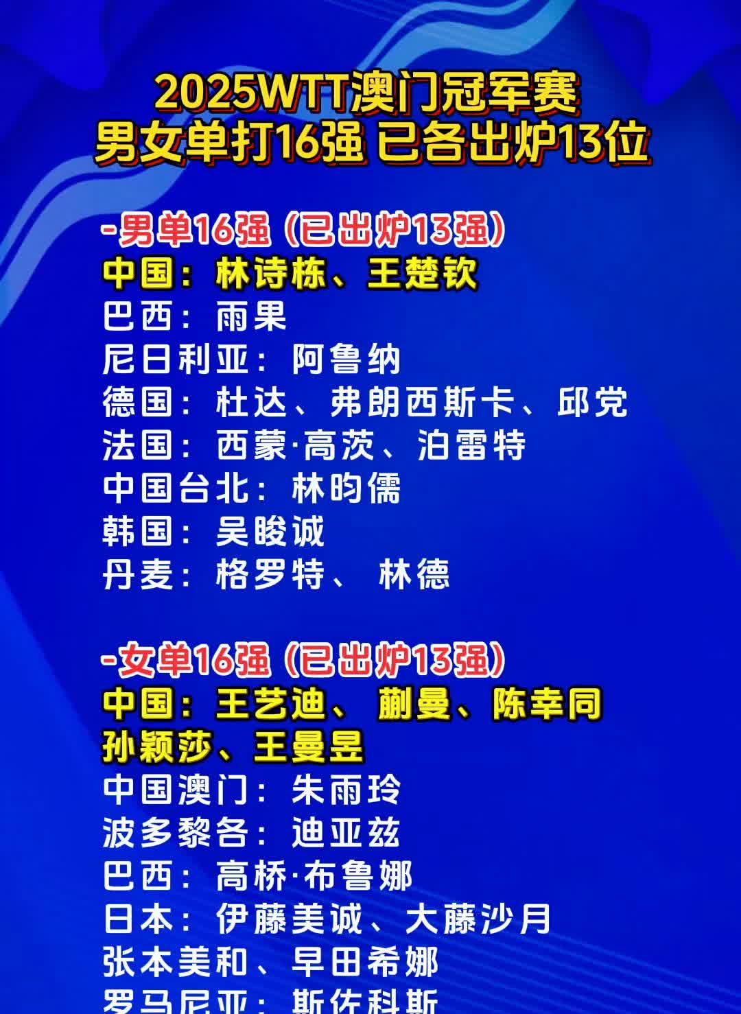 2025WTT澳门冠军赛男女单打16强已各出炉13位。 ·男单16强(已出炉1