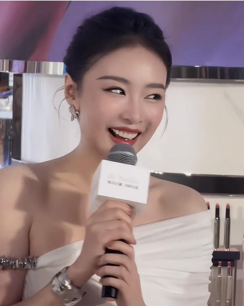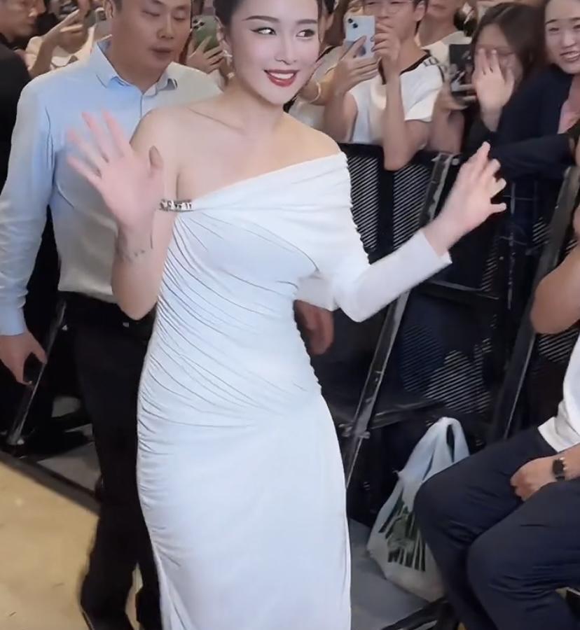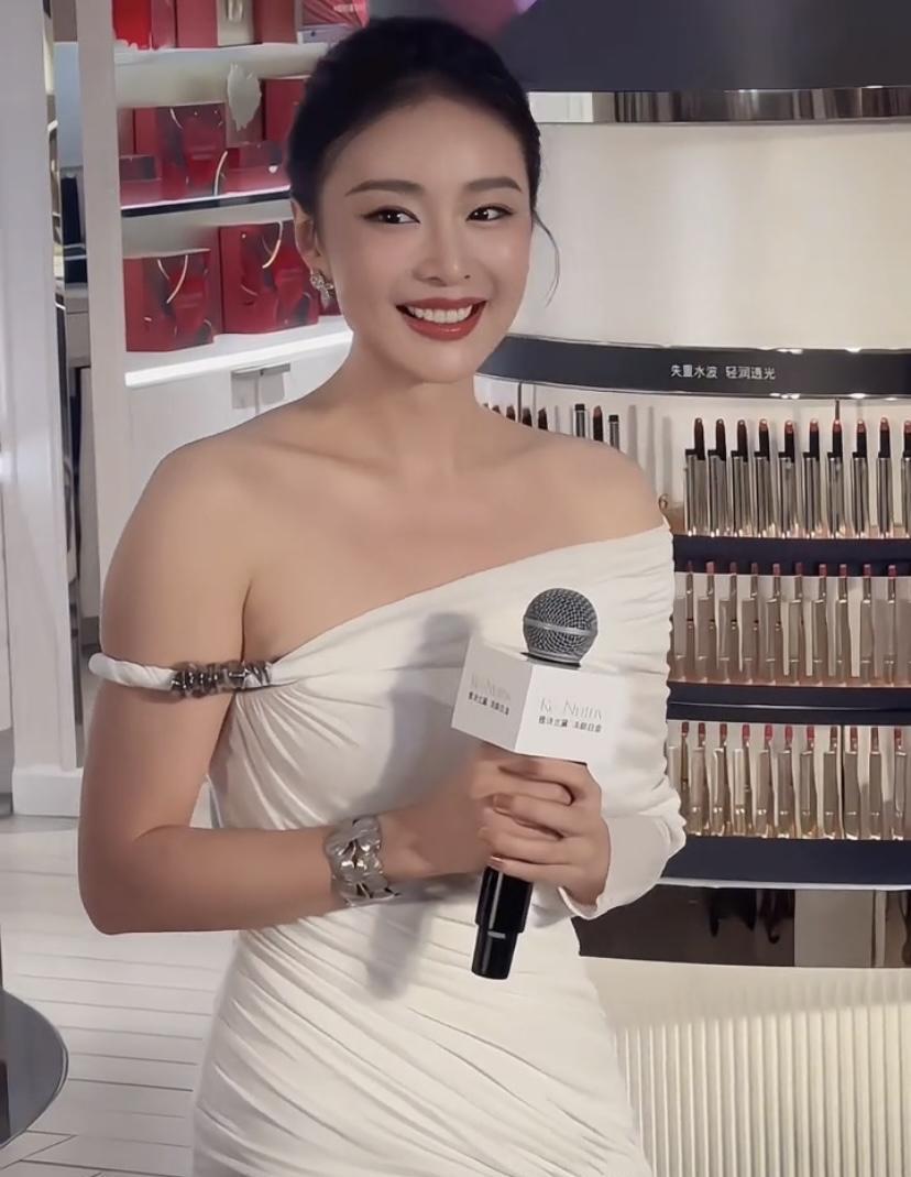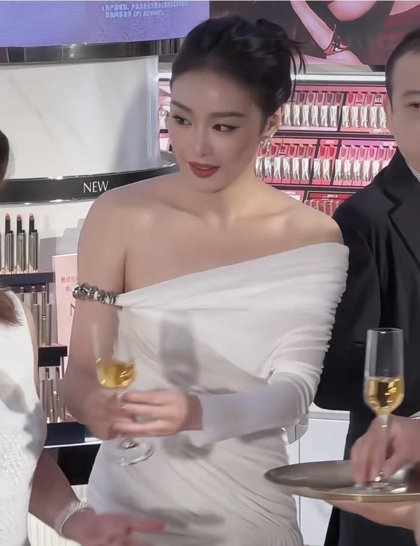 高叶出席商务活动穿的斜肩白色裙子太惊艳了!她为化妆品站台时,这身白色无袖修身晚