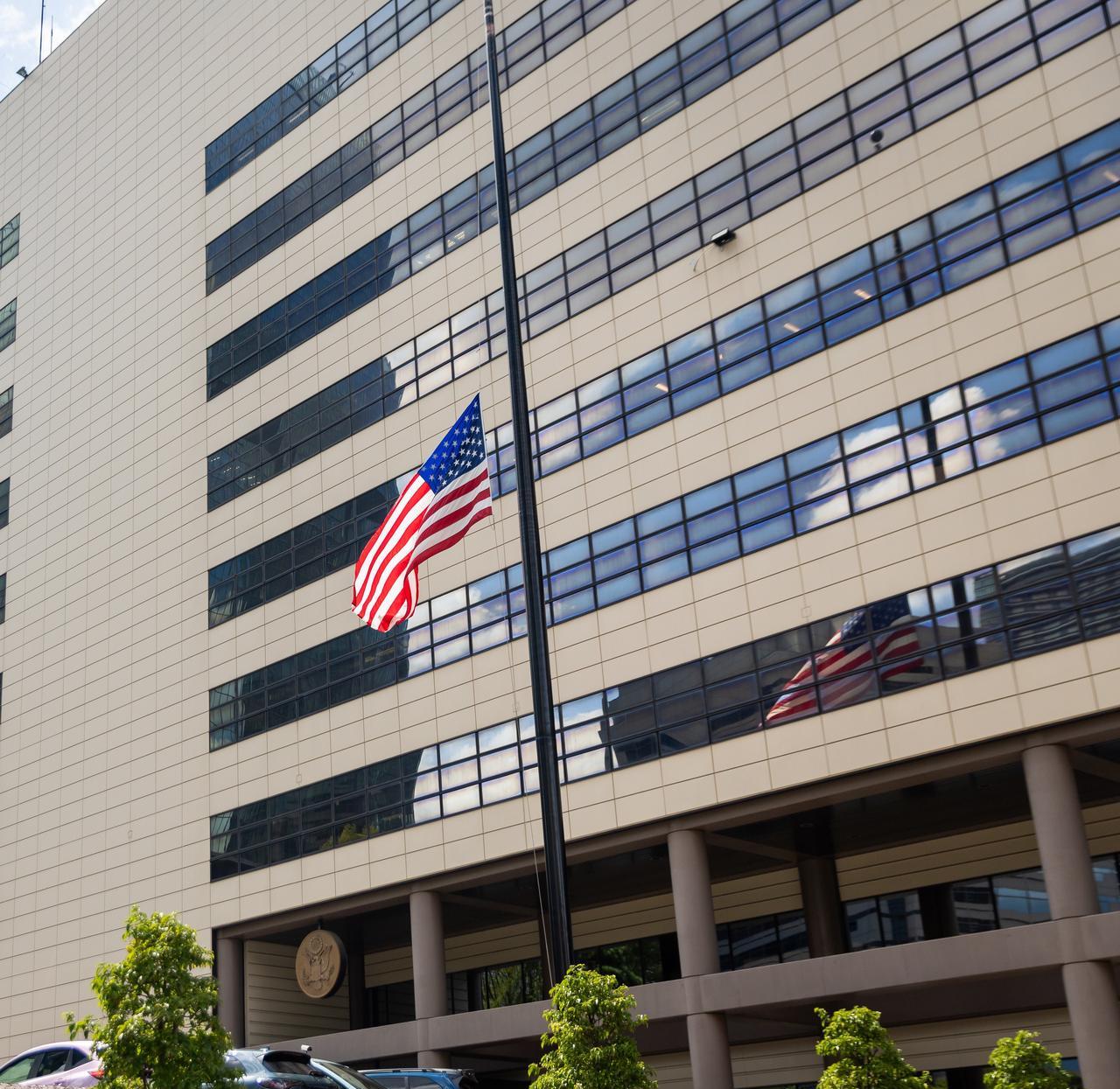 美国驻日大使馆,降半旗。美国著名保守派人士查理·柯克遇袭身亡,特朗普下令全国降半