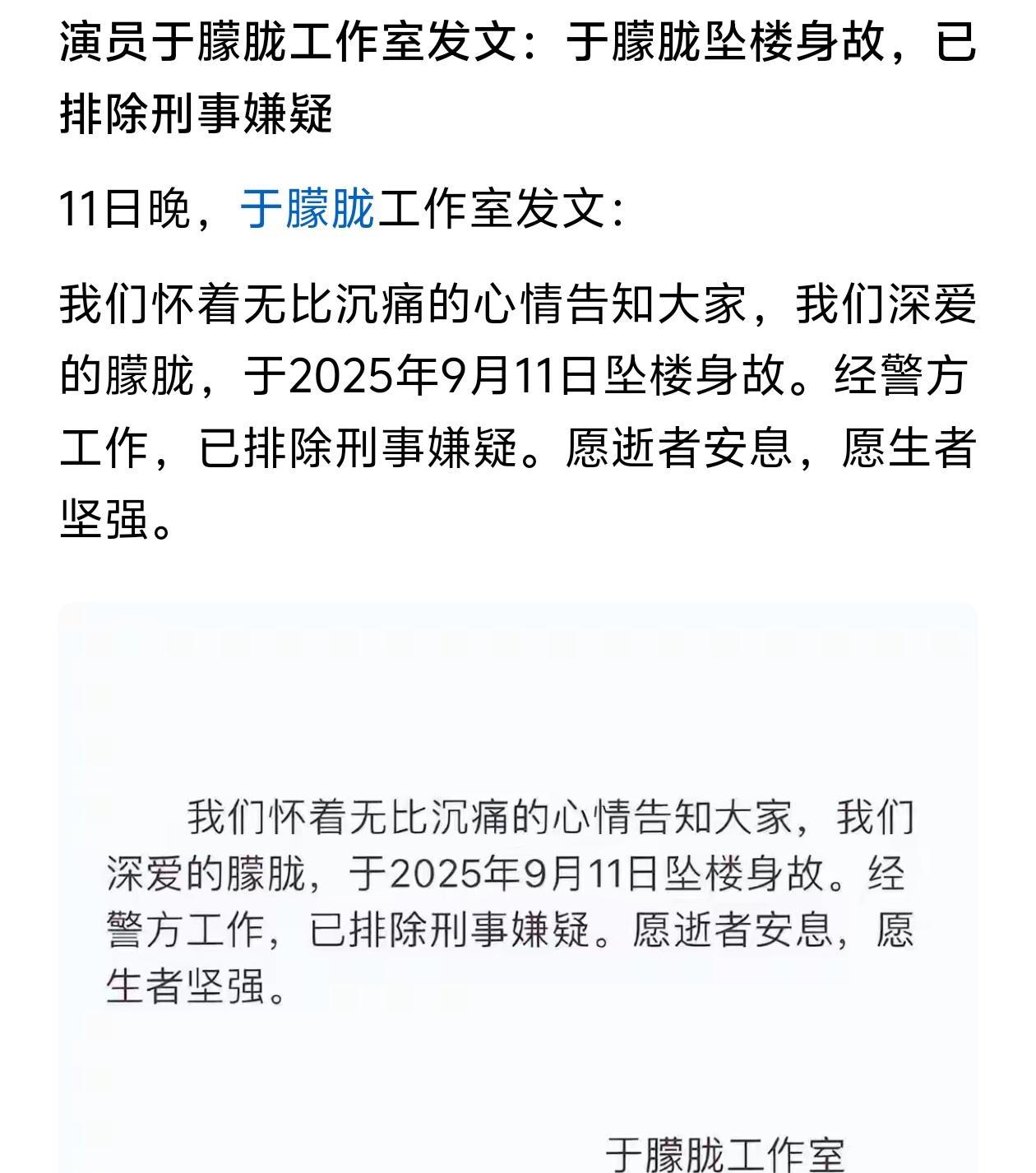 真希望于朦胧快出来辟谣吧。真的不希望是真的,但是已经实锤,于朦胧确实跳楼坠亡!9月11日晚,于朦胧工作室发文:我们怀着无比沉痛的心情告知大家,我们深爱的朦胧,于2025年9月11日坠楼身故。经警方工作,已排除刑事嫌疑。愿逝者安息,愿生者坚强。 #于朦胧# #于朦胧跳楼坠亡#