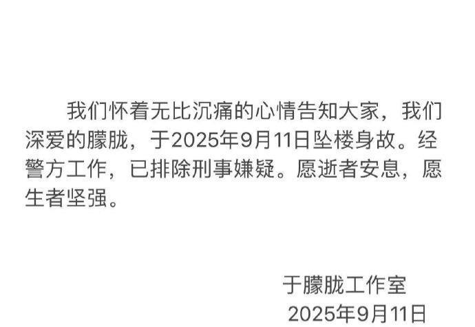 于朦胧工作室发讣告:于朦胧9月11日坠楼身故,警方排除刑事嫌疑,愿逝者安息