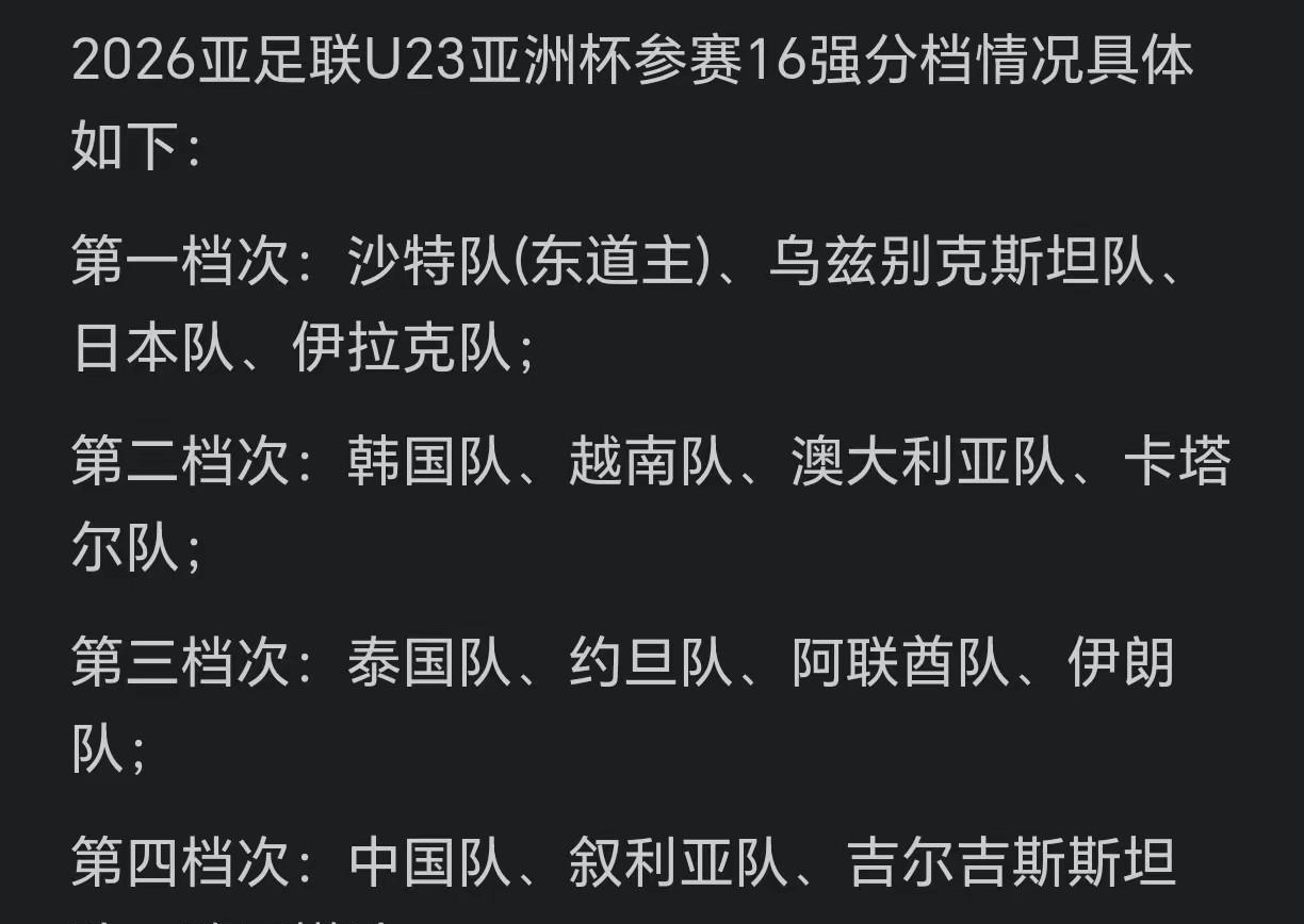#秋日生活打卡季#第七届U23亚洲杯决赛阶段比赛明年初在沙特进行。预赛已经结束了,十五支出线球队和沙特分成四个小组,小组前两名出线,10月将进行分组抽签仪式。 按以往战绩,亚足把这些队分成了四个档次,国青队被分到第四档。很多球迷又开始黑国青出不了线了,又分到了死亡之组啥的了。其实每支球队都是靠真正的实力来决定地位的,日韩伊澳他们也是多少年打下基础才有今天成绩的,分组啥样谁也左右不了,实力强大分到啥组也不会怕。 咱们第一档次只有沙特队还算好对付一些,其他都是硬朗对手,难以拿分。第二档次要分到越南,卡塔尔之一最好了,韩澳两队我们没有多少把握。第三档次球队就是别分到伊朗一组就行。 感觉我们球员伤病情况好了,人员充足了,安帅选择余地也大了,有联赛的锻炼这些小将水平提高会很快,再磨合磨合就行了。小组出线也不是天方夜谭,又不是成年队比赛,和强队之间没那么大差距。