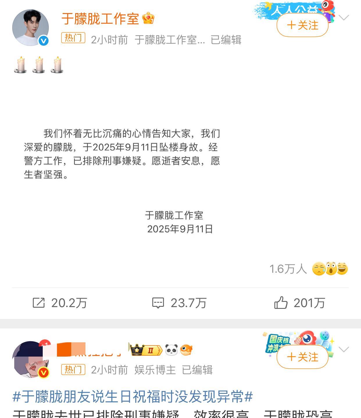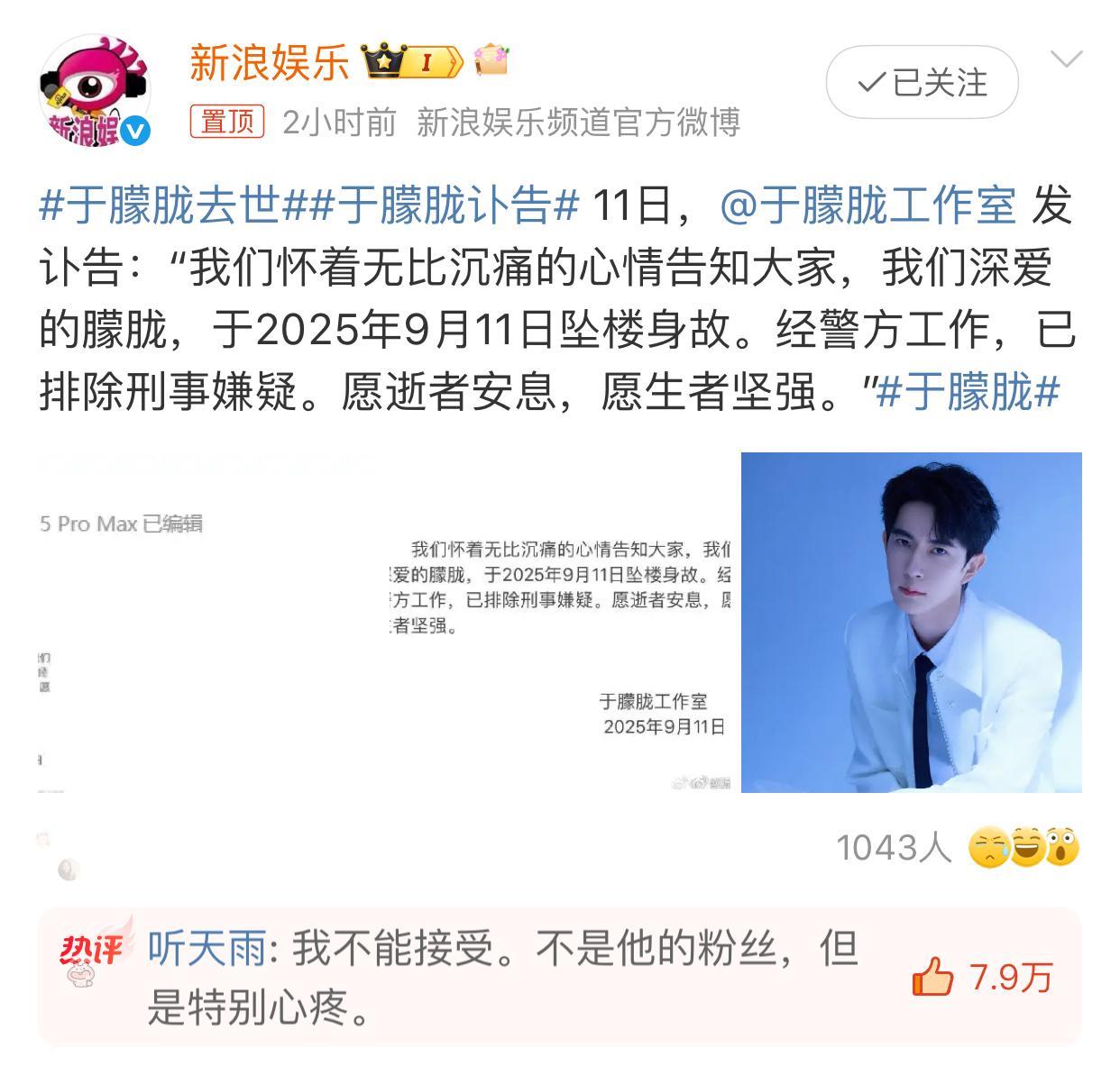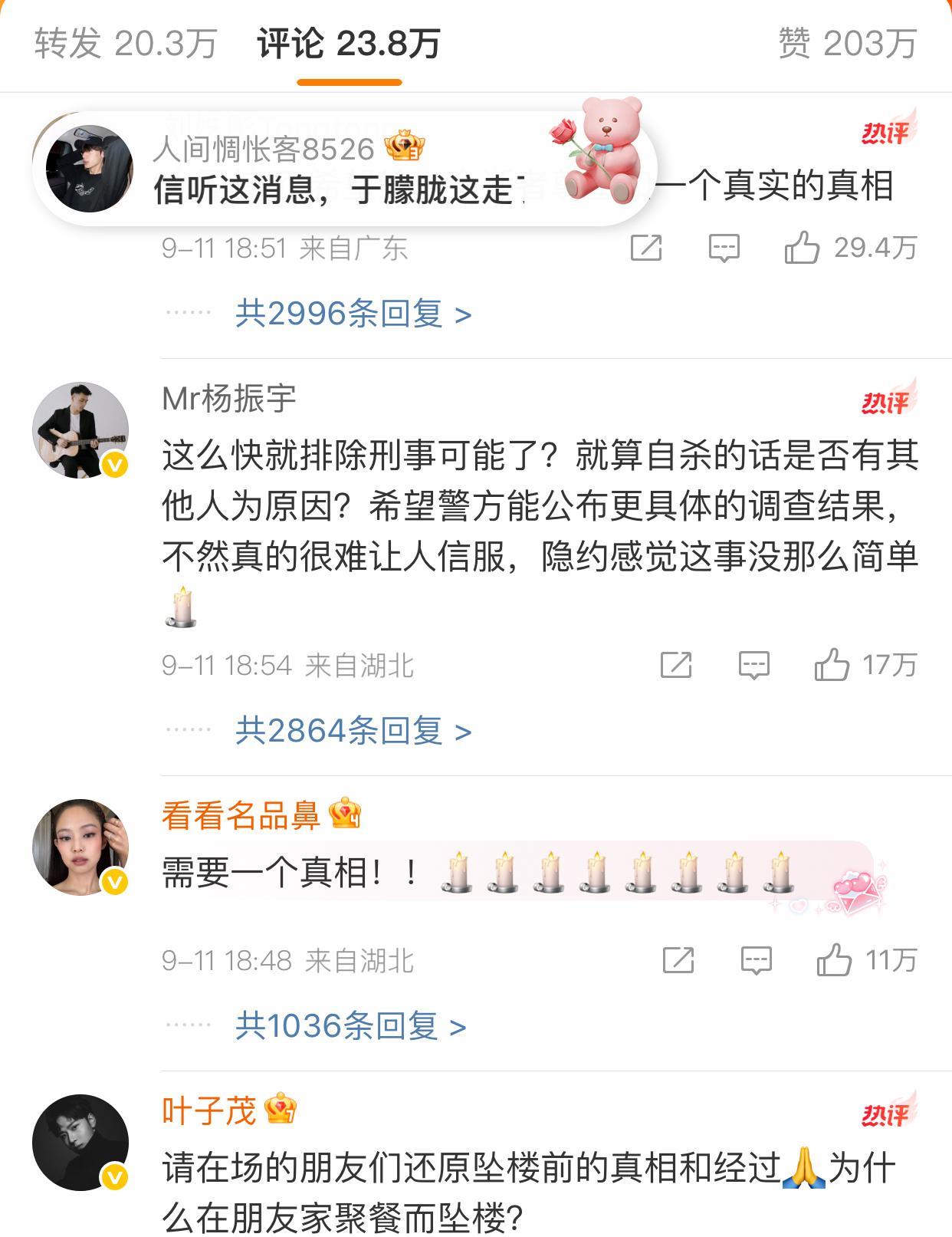 #于朦胧# 热搜炸了,网友何以愤懑不平?匪夷所思的点在于: 一:据说他恐高!所以自己跳的概率很低…… 三:按照他的性格不喜欢麻烦别人,所以就算是跳也不会去别人家。 四:新剧据说要官宣! 五:第二天就要出镜央视了,他也不是不负责的那种人! 网友没一个信的,都在等一个真相! 于朦胧 下辈子 当个普通人吧!这个圈子太复杂,你这样干净性格的人或许真的融不进去~ 希望下辈子可以幸福 平安 !