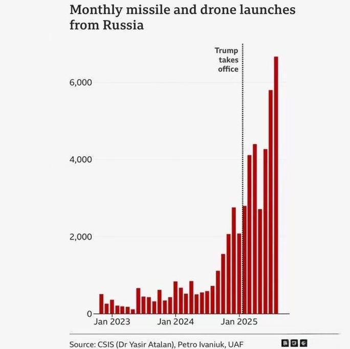 数架俄罗斯无人机突入波兰的领空,北约又能奈他何? 当特朗普为普京铺开红地毯的时候,普京就不在乎北约了。因为他知道,只要特朗普在白宫,北约的第五条款就形同虚设。不论普京做什么,特朗普都会给他无数个“两个星期”。 图六是俄罗斯对乌克兰远程袭击的统计。自特朗普当选以来,普京就肆无忌惮了。#波兰被轰炸# #波兰军事安全# #俄对北约开战#