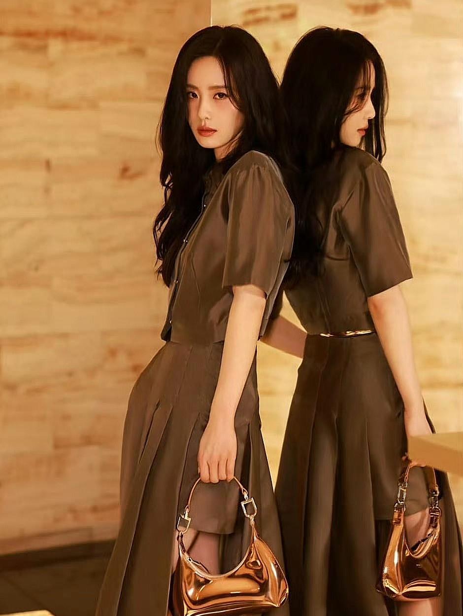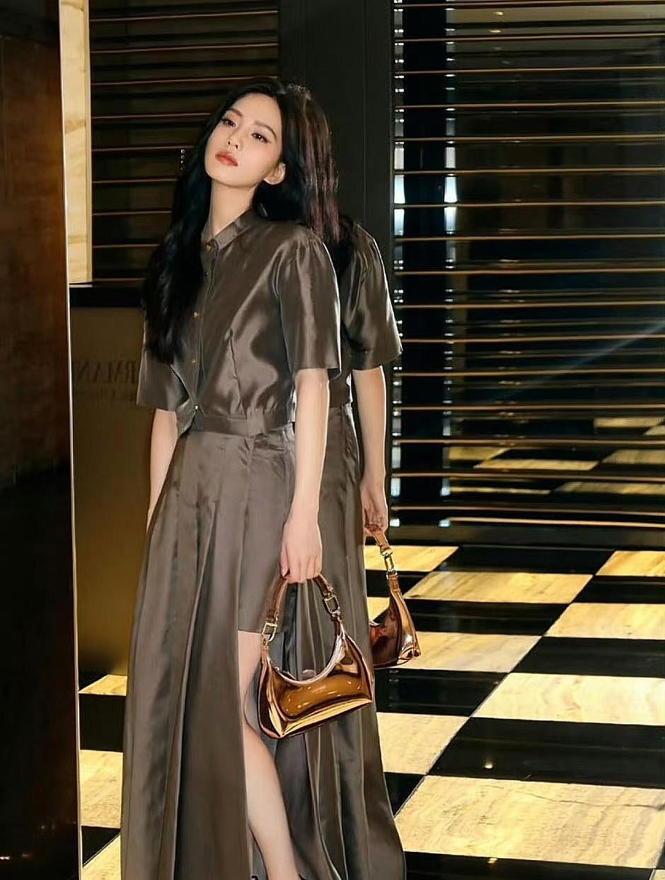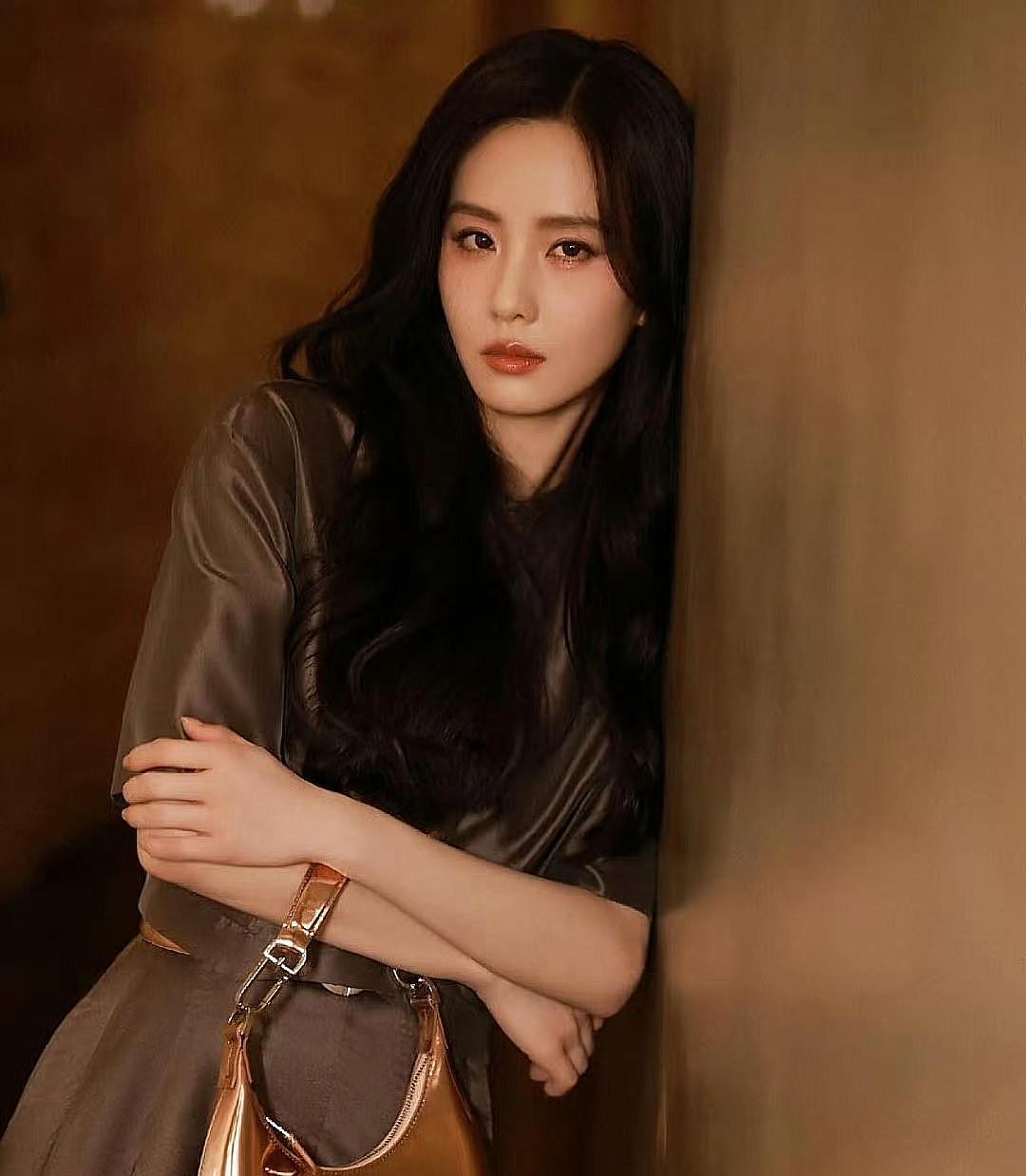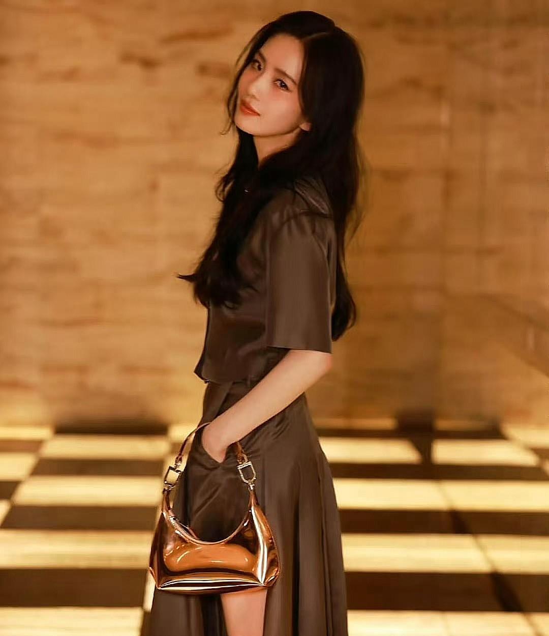 谁能拒绝微醺感拉满的刘诗诗? 一身深棕系丝质套装,长发微卷,眼神带着恰到好处的朦