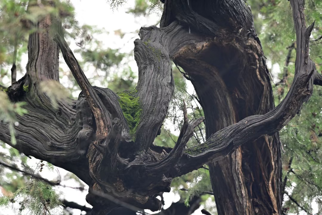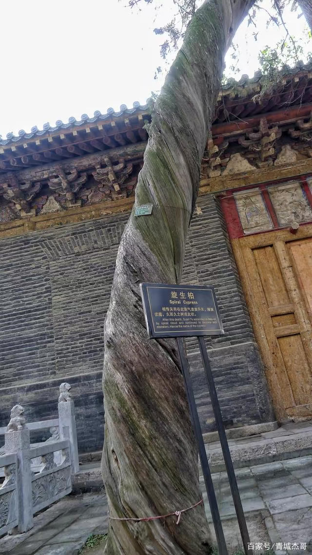关帝陵前,旋生柏的树干旋转着生长,传说关公常驾着一股白气,旋转着升到空中,去各地降妖除怪。旋转的气流把柏树拧成了麻花。