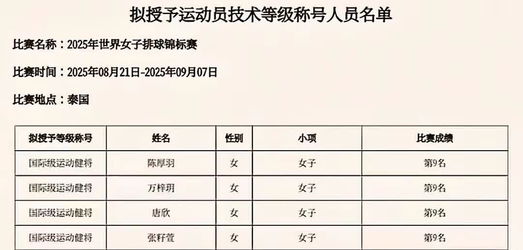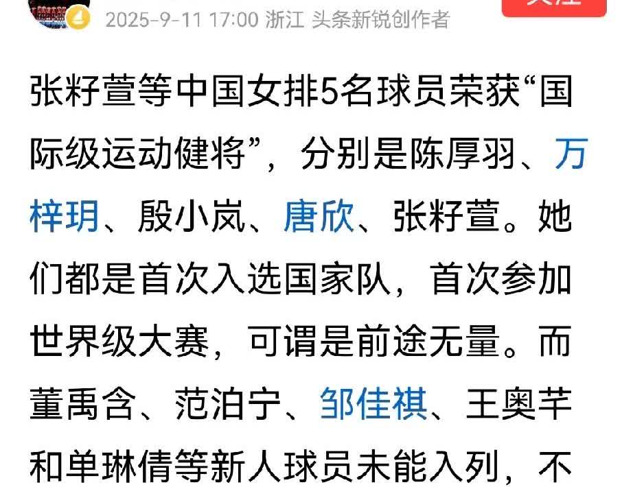 刚刚看到自媒体“浦江说体育”报道:张籽萱等中国女排5名球员荣获“国际级运动健将”