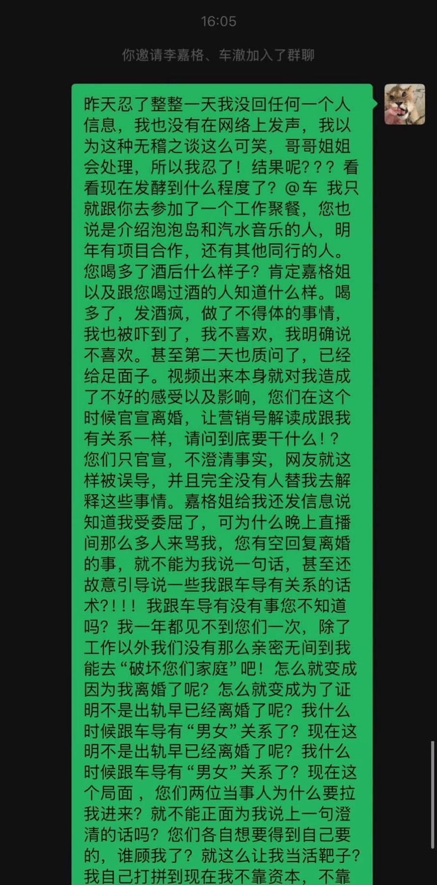 乃万开撕李嘉格,这是咋啦?乃万发了一大篇长文控诉被污蔑当小三,现在李嘉格和车澈已经离婚了,所以关李嘉格什么事? 貌似是因为乃万跟车澈吃饭被拍,正巧李嘉格和车澈官宣离婚不久,不少言论暗指乃万是小三,现在乃万在社交平台上写了一大篇文澄清自己不是小三,而且还把李嘉格车澈拉群,要求对方公开澄清。 不过这被拍已经是两三天前的事,被拍的新闻出来之后李嘉格都立马官宣已经离婚了,这已经很够义气了吧?如果不说离婚,乃万的舆论压力不是更大吗?还有,图片很清楚地拍到两人拥抱,车澈还为乃万捏肩,这明摆着两人挺熟的吧? 有说是因为车澈发酒疯才对乃万又抱又捏,所以这关李嘉格啥事啊?李嘉格说得对,她不应该为此事负责,李嘉格看到都得一头雾水吧?联系乃万直接开麦炮轰车澈。