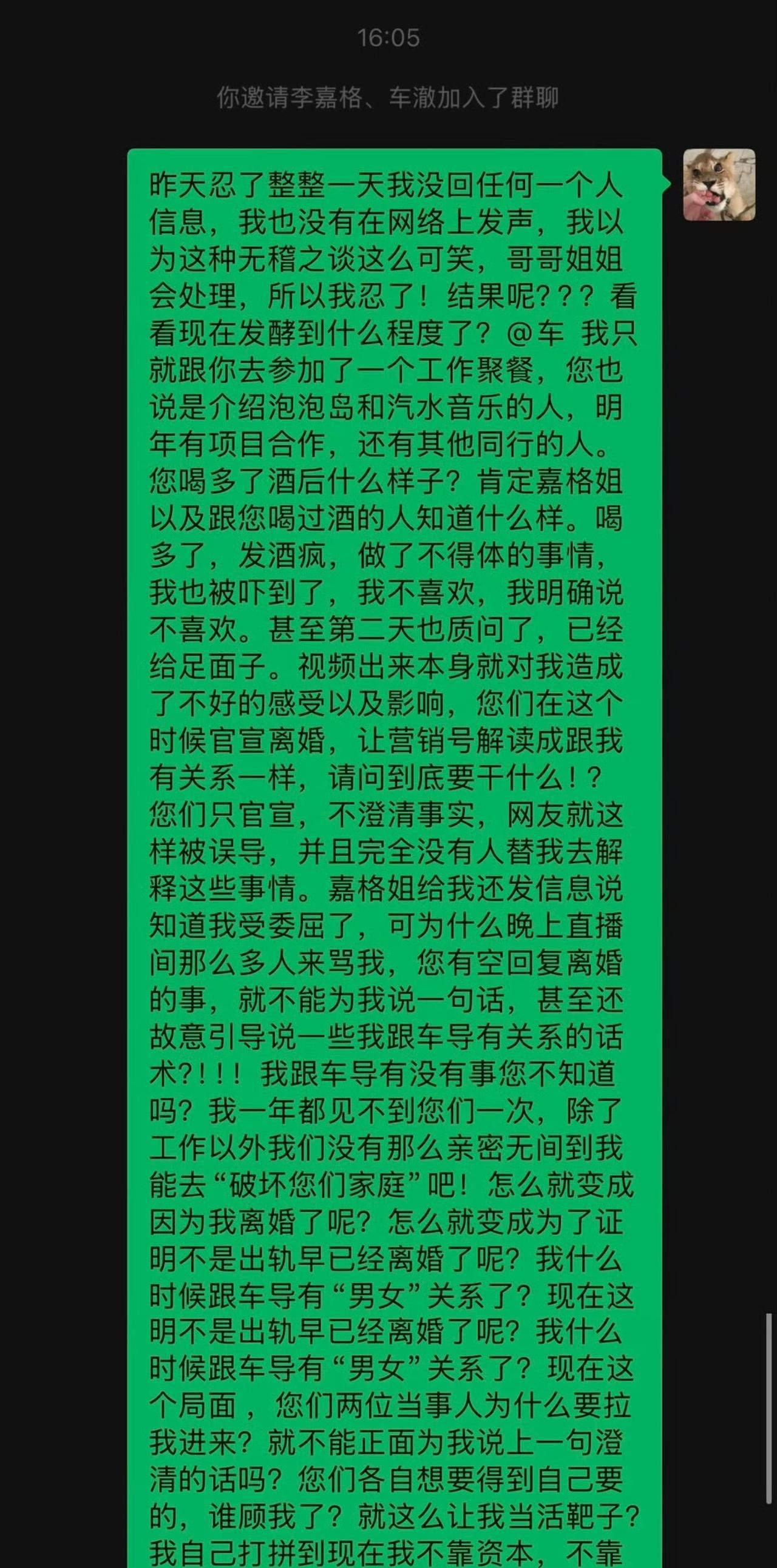 乃万发文回应与车澈亲密行为,称自己无妄之灾!乃万发出来自己与车澈的聊天记录截图,称自己只是参加一个很正常的工作聚餐,却被喝多了酒的车澈做了“不得体的事情”,更是把李嘉格跟车澈拉到一个群里直接开炮,车澈称会正面回应。李嘉格则回复:我想我不该为此负责。 李嘉格第一时间就澄清很早就与车澈离婚了,这不就是直接帮乃万澄清了不是“小三”吗?怎么还在对李嘉格这么大怨气?最大问题不是车澈吗?