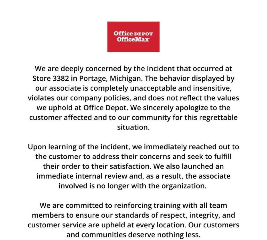 欧迪办公(Office Depot) 是美国一家总部位于佛罗里达州的大型连锁办公用品店。今天密歇根州的 一家Office Depot 员工断然拒绝为当地守夜活动印制查理·柯克的致敬海报, 他们称之为“政治宣传” 。 于是美国舆论哗然, 开始抵制Office Depot,刚刚该店总部发文抱歉,并且开除了这些涉事员工,还为顾客免单。 Office Depot 说深表歉意,开除员工,将会整改,加强员工培训