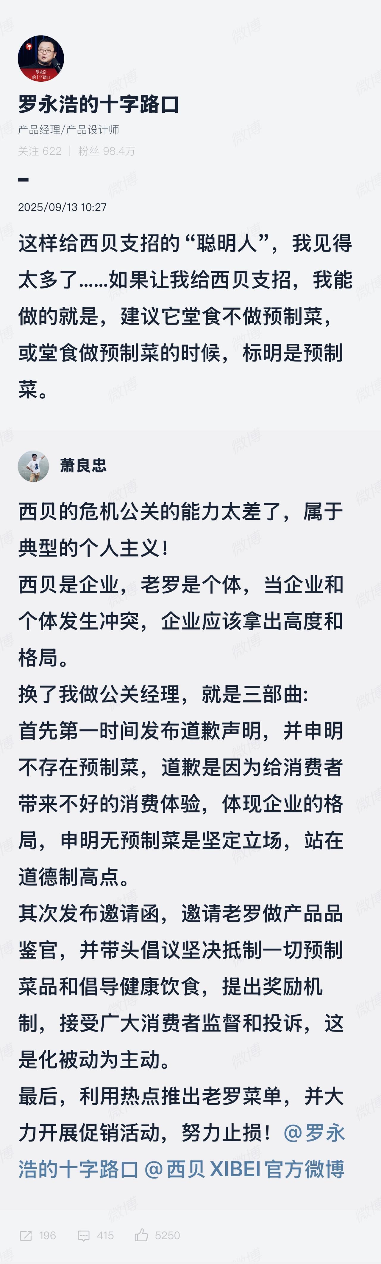 知识与素养是什么样的人,就会做出什么样的品牌传播和什么样的负面公关。西贝预制菜这件事目前为止根本没怎么展现老罗的传播功力,整场下来只是看到他思考正常,逻辑正常,情绪正常而已。