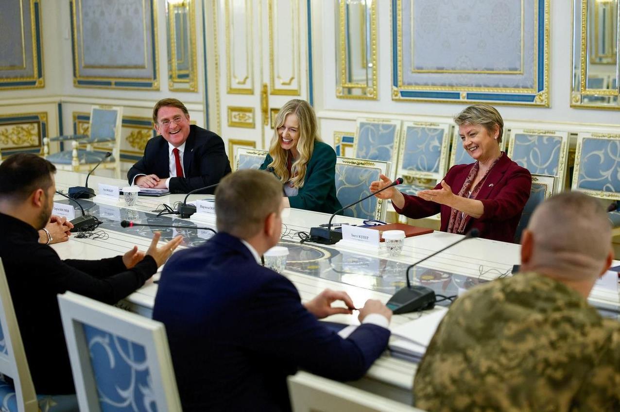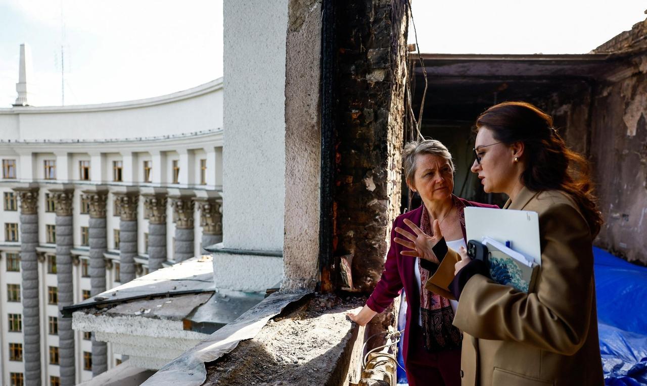 女大臣访问乌克兰,来到被炸大楼参观。英国新任外交大臣伊薇特访问乌克兰,会见泽连斯