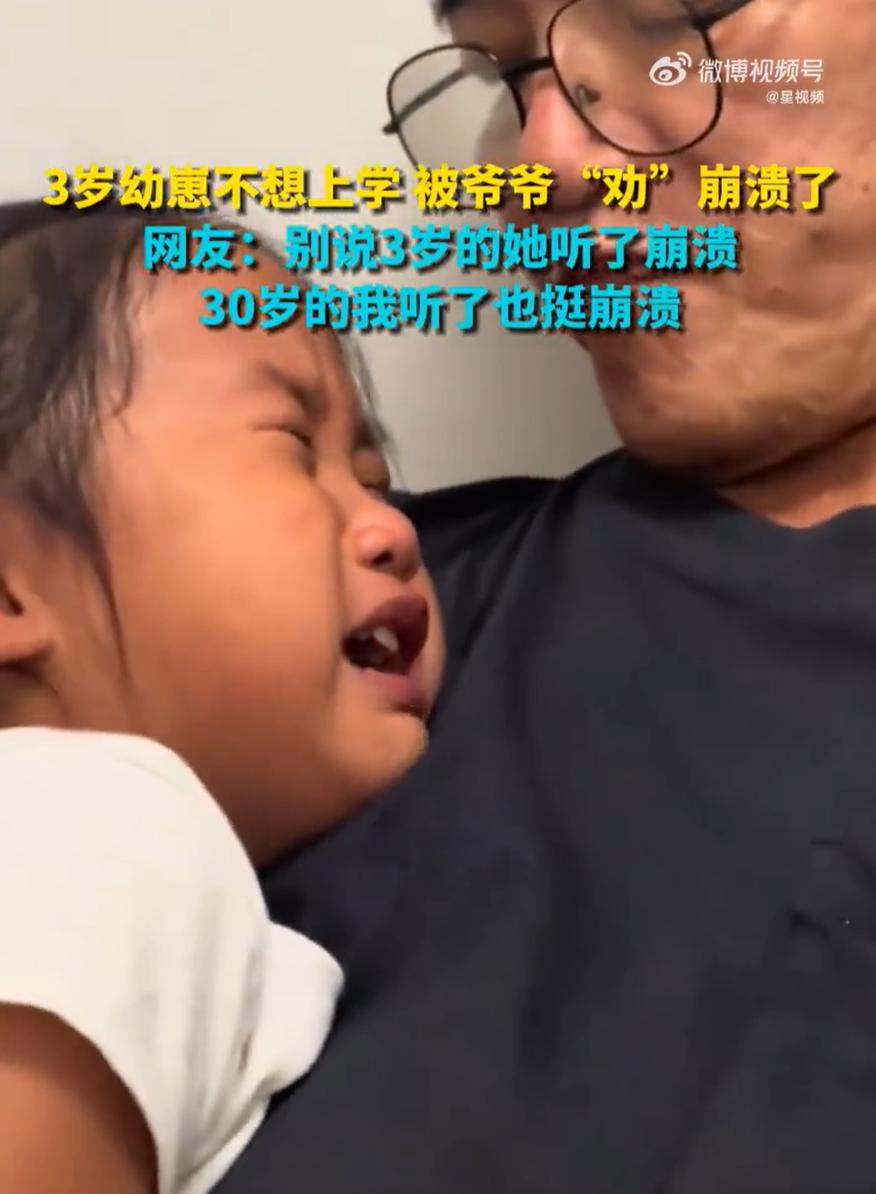 “笑不活了!”北京,一个三岁的小女孩因为不想去幼儿园,趴在爷爷怀里掉眼泪。她抽抽搭搭地问,自己什么时候才能不用上班也不用上学。爷爷本来想哄她,就随口说,再坚持57年就可以了。没想到孩子一听,当场哭得更凶了。网友:爷爷别劝了,我30岁听了也挺崩溃! 视频里,小女孩赖在爷爷胸前,带着哭腔说:爷爷我不想上学,我就想在家待着。爷爷耐心地回答:那你要等到像爷爷、奶奶,或者姥姥姥爷这么大,就不用上班上学了 小女孩一听,情绪明显更激动了:那怎么要那么久啊! 爷爷接着算给她听:是啊,等你到60岁,差不多还要57年。到那时候,你就不用上班也不用上学啦 结果萌娃一听还要57年,彻底崩溃,眼泪哗哗地止不住 有网友调侃说:这爷爷是懂安慰人的,要不然不会说就别说了 还有网友自嘲:别说孩子了,我今年30,听到这个数也有点想哭 其实回头想想,爷爷说的虽是大实话,却也无意中戳中了很多人的内心。从小到大,我们似乎总在“熬日子”,念书时盼毕业,工作后盼退休,总以为幸福在遥远的以后。却常常忽略了,人生每一个阶段都有它独特的滋味,过去了就再也回不来 孩子不愿意上学很正常,但更重要的是引导她发现当下的快乐,和小朋友一起玩耍、学到新知识的好奇、一点点成长的成就感。而这些,恰恰是长大后最怀念却再也回不来的东西 与其告诉孩子“再坚持几十年”,不如陪她感受今天的小美好。因为人生不是熬出来的,而是过出来的