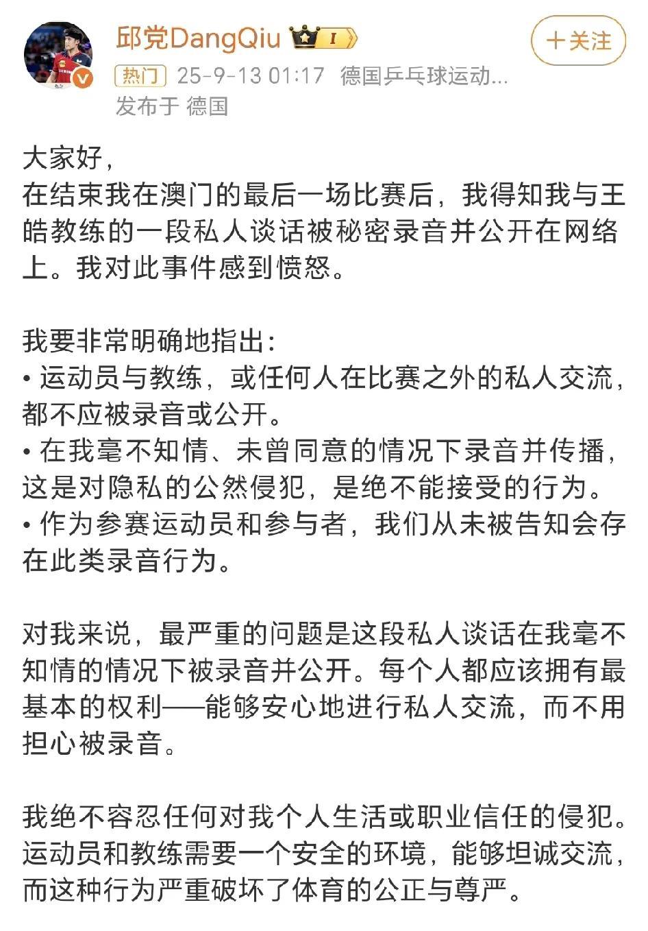 到底是谁暴露了王皓和邱党关于樊振东的谈话? 录音很清晰,感觉对方离得应该很近,不然录不出这么清晰的对话 录音内容其实没啥,就是很平常的闲聊 但是这件事的重点不是录音内容,而是被暴露出来这件事本身 侵犯了别人的隐私! 尽管内容没什么,也没人有权这么做,如果支持这样,大家的隐私权怎么保障? 据说德国那边一直保密樊振东的住所,在这段交谈里邱党说出来了,虽然没说的特别具体,但是也涉及到了樊振东的个人隐私 录音并公开的人,其心可诛! 应该受到惩罚 大家说对不对? #王皓# #樊振东# #邱党#