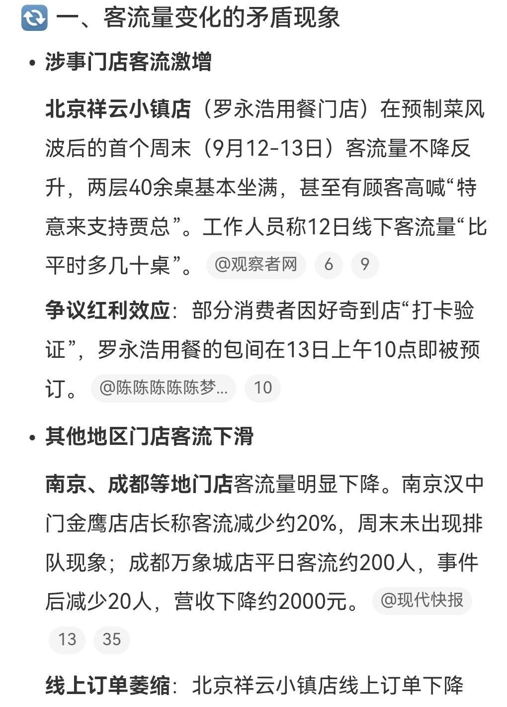 杠上了,杠上了。 近日,罗永浩在西贝北京祥云小镇店搓了一顿,发文说几乎全部是预制菜。 创始人说要告罗永浩。 9月13日,媒体报道涉事门店的生意不仅没减少,反而增加了。 对此,罗永浩回应说:请开始你的表演。 认为涉事门店造假。 不过有其他门店的消费者是减少的。