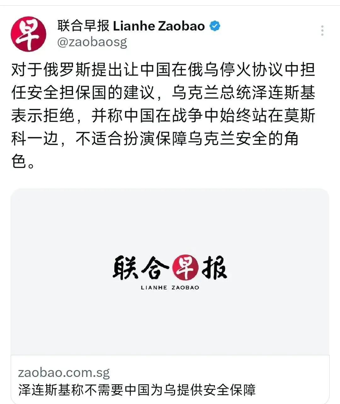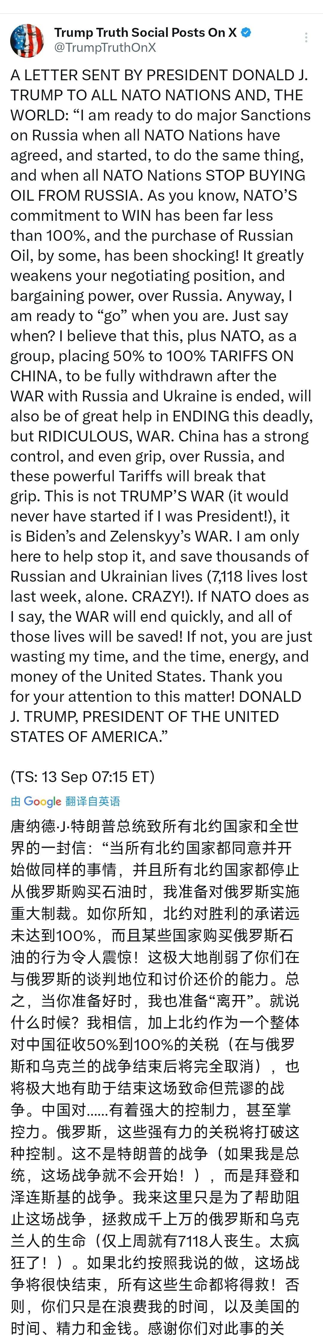 德国之声昨晚(9月13日)报道:“俄罗斯称与乌克兰的谈判‘暂停’,泽连斯基呼吁盟友敦促中国施压。俄罗斯周五表示,与乌克兰的和平谈判处于‘暂停’状态。特朗普再次表达对普京的‘耐心快要耗尽了’。泽连斯基呼吁盟友,敦促中国利用其对俄罗斯的影响力,制止莫斯科的进犯。” 泽连斯基的呼吁莫名其妙,俄罗斯是主权独立国家,中国也从不干涉他国内政。泽连斯基上月下旬刚刚说过拒绝中国在俄乌停火协议中担任安全担保的角色,又对在中国召开的上合组织峰会竭尽抹黑攻击之能事,现在又呼吁盟友对中方施压,要求中方制止俄罗斯,真是荒谬至极。中方对俄乌冲突的立场一以贯之,始终劝和促谈,但乌方总是置之不理,又能怪谁?特朗普今天依然表示,俄乌冲突是拜登和泽连斯基发动的战争(图6),泽连斯基还是找拜登解决吧!