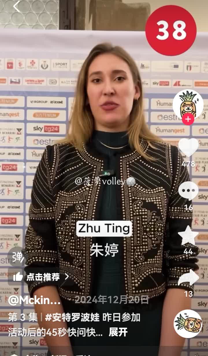 意大利球星安德罗波娃昨日在参加活动后的采访中,问及偶像时,她亳不犹豫地回答:母亲,当问及最激励你的人是谁时,她又一次亳不犹豫地说:朱婷。安德罗波娃于2022-2023赛季与朱婷同季加入意大利斯坎迪奇女排俱乐部,成为队友两个赛季,结下了深厚的友谊,朱婷到科内利亚诺女排后,两人对阵,球赛结束后两人总要紧紧地相拥,久久不愿放手。安德罗波娃常常在采访中说朱婷是精神领袖,在球队里有精神稳定作用。前些日子,在采访时安德罗波娃还透露了她的梦之队成员,她的梦之队二传是沃沃什,接应为自己,主攻为托洛克、马尔科娃,副攻为法尔、达内西,自由人为卡斯蒂略。安德罗波娃现年才22岁,是目前世界排坛最年轻的接应球星,她身高2.02米,同朱婷一样,最善长超手进攻,高拦网也同样有一手,在这两方面的风格有些相近。