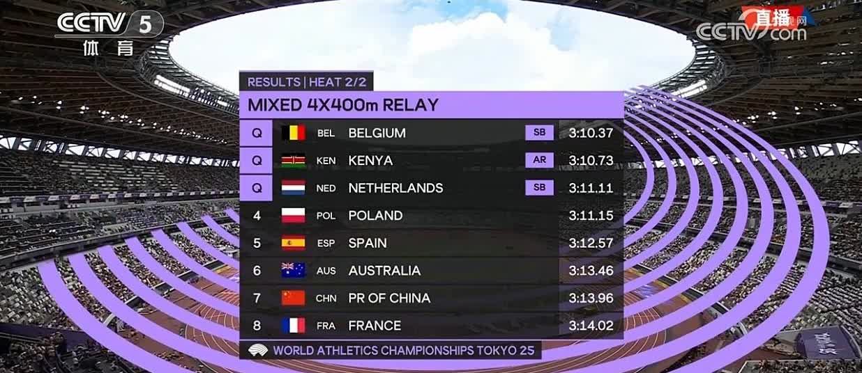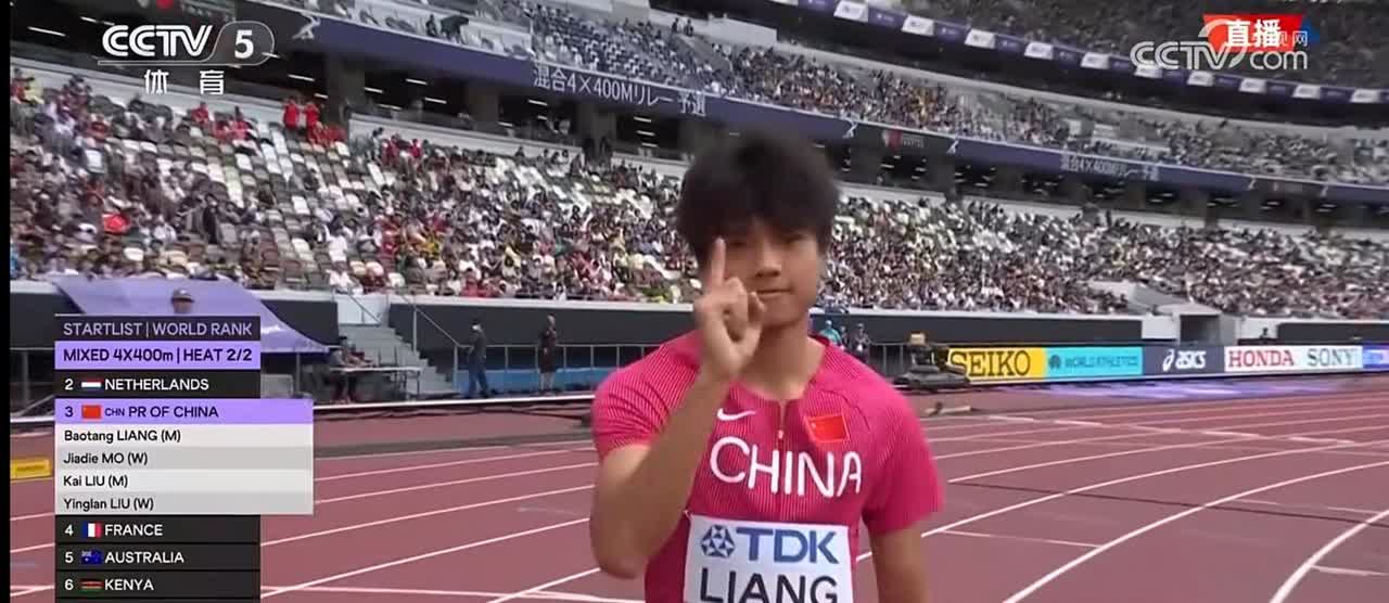 中国小组第7,无缘4x400混合接力决赛。 9月13日,东京田径世锦赛,男