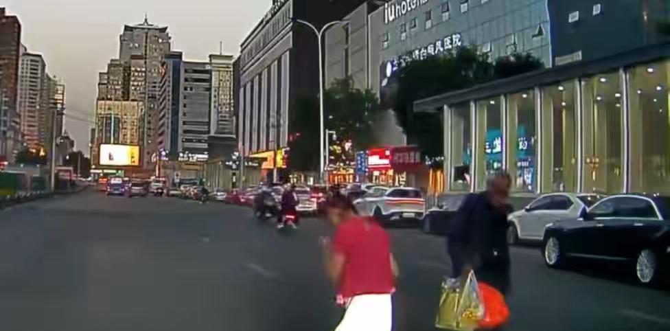 甘肃兰州,一老人手里拎着2个大袋子,踉踉跄跄的走在街头,一红衣女子开车经过这里,