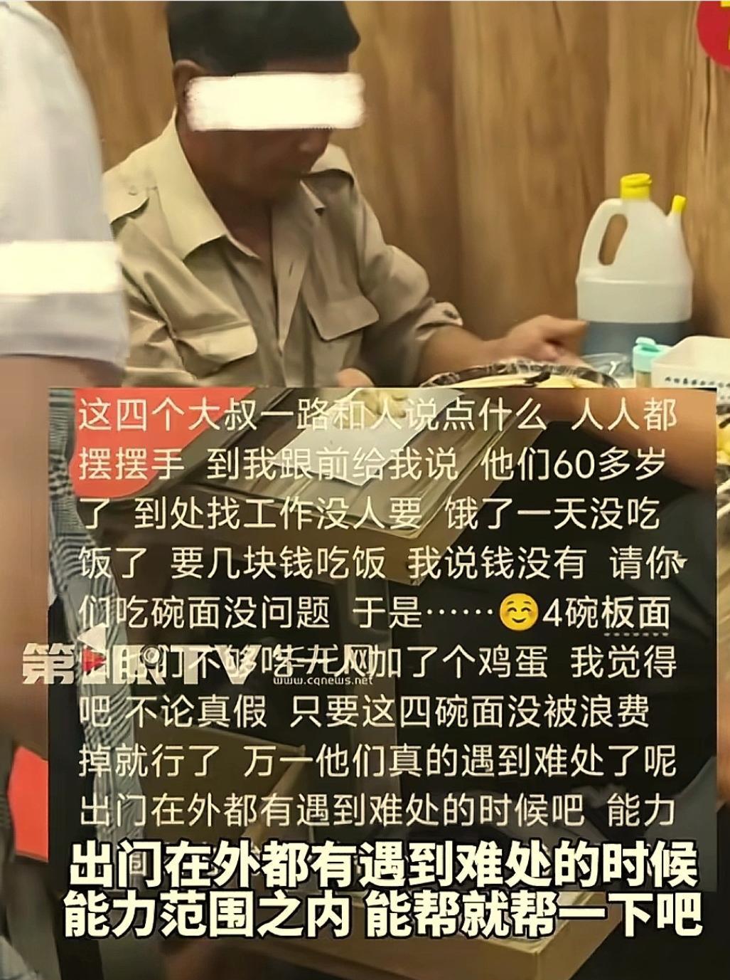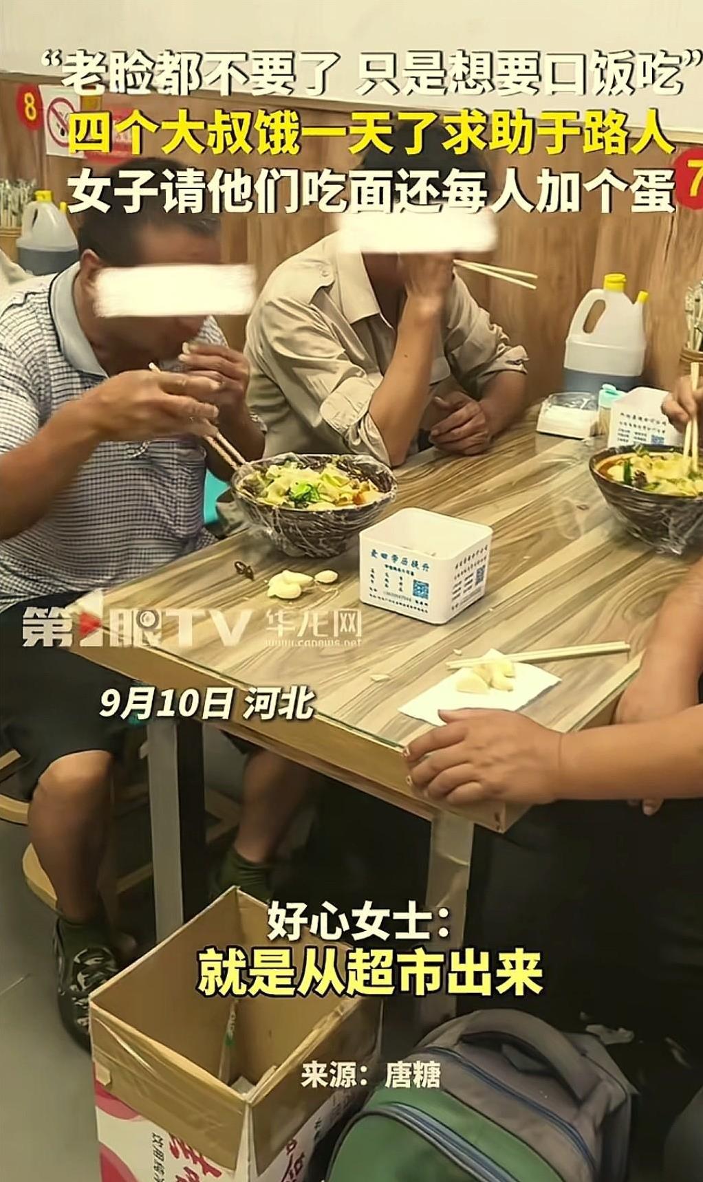 “这是真饿了。”9月10日,河北,一女子刚走出超 市,突然被4位60多岁的大叔拦住,请求给点吃的。女子以为4个人是骗子就要走,不料,大叔急了,扇了自己两巴掌:“我面子都不要了,就为一口吃的。”女子看了心酸,果断带人去面馆点了4碗面。可当面端上来时,大叔们都愣住了。 信源:华龙网视频 初秋的河北,一场淅淅沥沥的小雨刚歇,柏油路面还泛着湿润的光泽,晚风裹着水汽吹过,带起几分凉意。 李女士提着两大袋刚从超市采购的日用品,脚步匆匆,心里盘算着回家给孩子做顿热乎的红烧肉。 就在她走到街角电动车旁,准备弯腰解开防盗锁时,身后忽然传来几道滞涩的脚步声,紧接着是带着怯意的停顿。 李女士下意识回头,视线里闯进四个头发花白的身影 —— 年纪看着都在六十岁上下,身上的外套洗得发灰,袖口和衣角沾着星星点点的泥渍,像是在路边蹲坐过许久。 其中两人手里攥着揉得皱巴巴的布袋,袋口露出半截旧毛巾;另一个戴旧草帽的大叔,鞋子鞋底磨得快平了。 最先开口的是个额头刻着深深皱纹的大叔,声音沙哑得像是被砂纸磨过,每说一个字都带着吃力: “姑娘,俺们…… 俺们从老家来这儿找工地的活儿,连着三天没正经吃口饭了,能不能…… 能不能给俺们找点填肚子的东西?” 他说完,另外三个大叔也跟着点头,动作僵硬又急切,像是怕晚一秒就会被拒绝。 李女士的心瞬间提了起来,下意识往后退了半步。前阵子刷短视频时,她看过太多类似的骗局:有人穿着破旧衣服,说自己饿了要 “吃饭钱”,可其实后面还有陷阱等着自己 想到这些,她攥紧了手里的车钥匙,尽量让语气显得委婉:“不好意思,我没带现金,前面两条街就有救助站,我可以指给你们怎么走。” 可没等她的手碰到车锁,刚才说话的大叔突然急了,突然抬起右手,朝着自己的左脸颊狠狠扇了下去 ——“啪” 的一声脆响,在安静的街头格外刺耳。 大叔的眼眶红了,声音带着哽咽:“俺活了六十五年,从没在外人面前丢过这么大的人!俺面子都不要了,就为一口能填肚子的热饭啊!” 李女士看着大叔脸上清晰的巴掌印,听着他们带着乡音的辩解,心里像是被什么东西轻轻揪了一下。 她想起老家的父亲,也是这个年纪。眼前这四个大叔,说不定也是谁家的父亲,谁家的丈夫,为了给家里的孩子凑学费,为了给生病的老伴抓药,才背井离乡来到陌生的城市。 那点警惕心渐渐被心软取代,李女士直起身,把购物袋放进电动车筐里,对四位大叔说:“前面街角有家面馆,我带你们去吃点热的。” 面馆里暖黄的灯光透过玻璃窗洒出来,李女士直接走到收银台,点了四碗大碗牛肉面,又特意叮嘱:“每碗都加个卤蛋,多放两勺汤。” 面很快端了上来,四个大叔也顾不上烫,低头就狼吞虎咽起来。吸溜面条的声音、喝汤的声响在小小的面馆里此起彼伏。 不到十分钟,四碗面连汤都被喝得干干净净,连碗底的葱花和香菜都没剩下,几个大叔放下碗时,还下意识地舔了舔嘴唇。 看着大叔们感激离去的背影,她心里也泛起一阵暖意 —— 出门在外,谁还没个难的时候?今天她帮了这四位大叔,说不定哪天自己的父母在外遇到难处,也会有陌生人伸出援手。 但这份善意里,始终藏着该有的分寸,不是所有 “求助” 都是真心实意。 去年就有新闻报道,一群骗子专盯心软的年轻女性,有人装作饿了要 “吃饭钱”,拿到钱后又以 “需要路费回家”“孩子生病要买药” 为由继续索要,一旦被拒绝就纠缠不休; 还有更恶劣的团伙,会让女性成员以 “独自在外遇到困难” 为借口,引诱好心人带路,把人骗到偏僻的废弃厂房实施拐卖。 所以遇到类似的求助:如果对方开口要钱,无论说得多可怜,都坚决不给,因为真正饿了的人,更需要的是能直接填肚子的食物,而非现金; 如果对方说饿了,就像这次一样,直接带去面馆吃饭,或者去便利店买面包、方便面、牛奶等实物; 要是对方拒绝实物救助,执意要现金,或者提出 “去你家拿点吃的”“带你去个地方找我家人” 等奇怪要求,一定要立刻离开,尽快走到人多的地方。 其实善意和警惕从不矛盾。对陷入困境的人伸出援手,是为人处世的温度;对潜在的风险保持戒备,是保护自己的智慧。