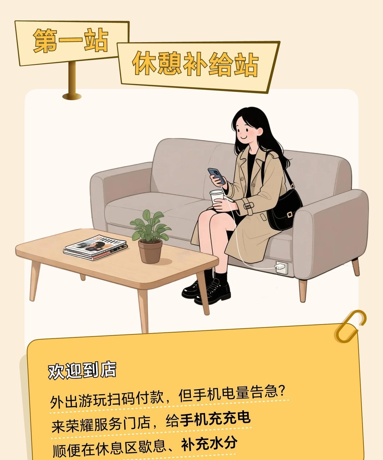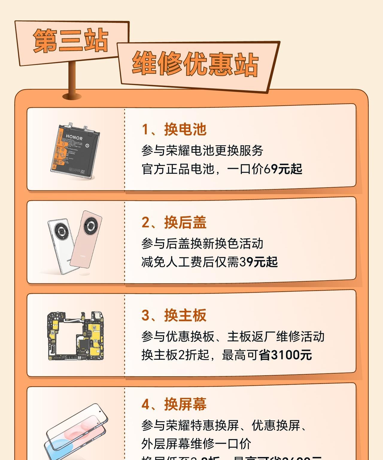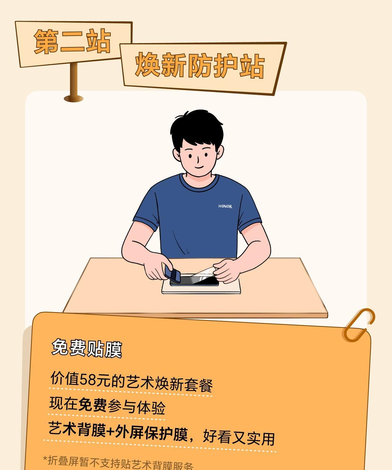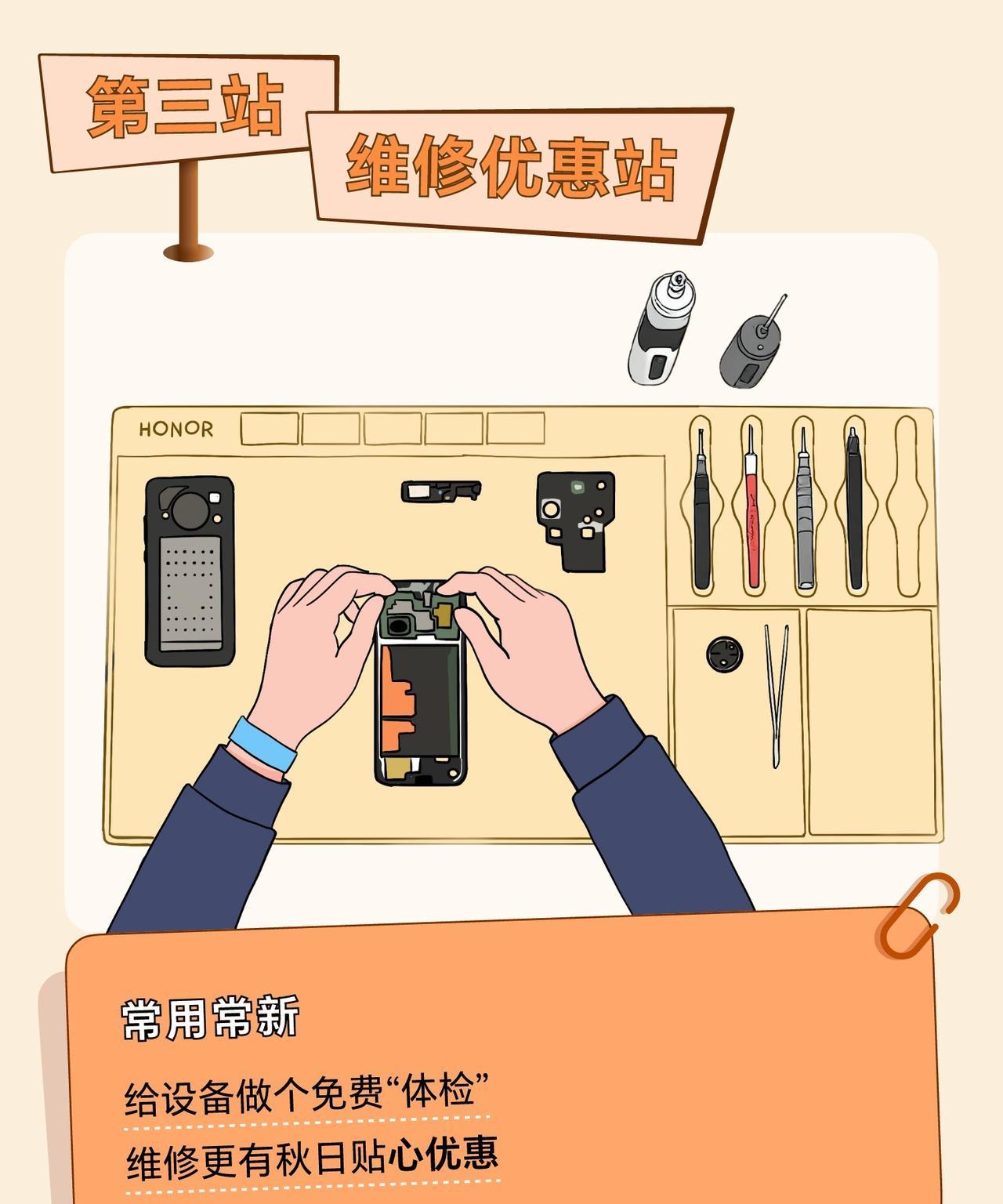 荣耀服务门店能够为消费者提供什么服务呢?刚刚看到荣耀客服分享的一组图文,据说线下服务已经升级,荣耀服务门店化身秋日能量驿站,大家在游玩闲暇小憩的时候,可以来到这里免费充电,同时也可以休息歇脚,补充一下水分,我觉得蛮贴心的。 当然作为荣耀服务门店,主责主业同样也做的更好。例如可以来这里免费贴膜,价值58元的艺术焕新套餐我也是蛮喜欢的。还可以对荣耀设备做免费体检,维修也有优惠的。这里可以换电池、换后盖、换主板、换屏幕,一站式的服务让消费者更舒心。
