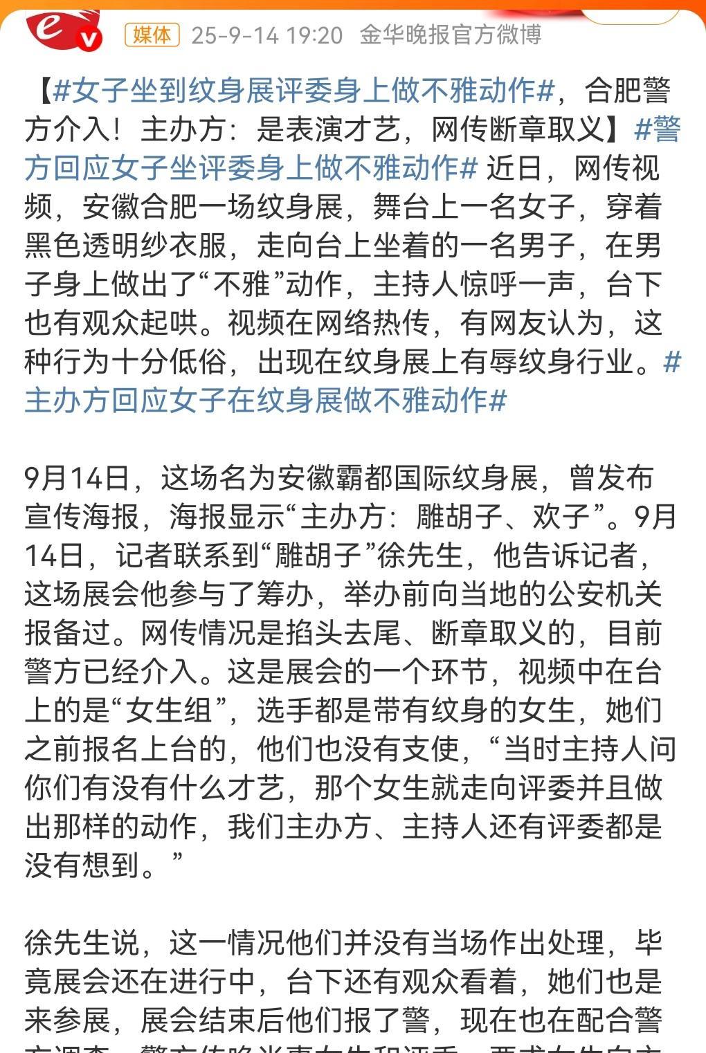 实在是让人瞠目结舌,太没底线了。 9月14日有媒体报道。 女子坐到纹身展评委身上