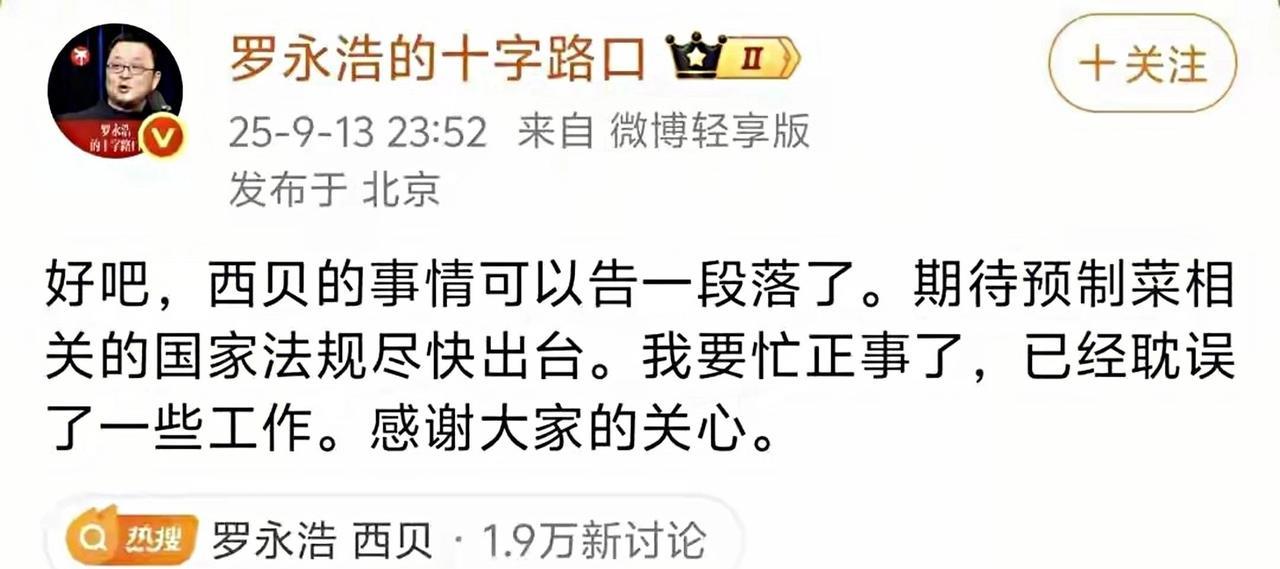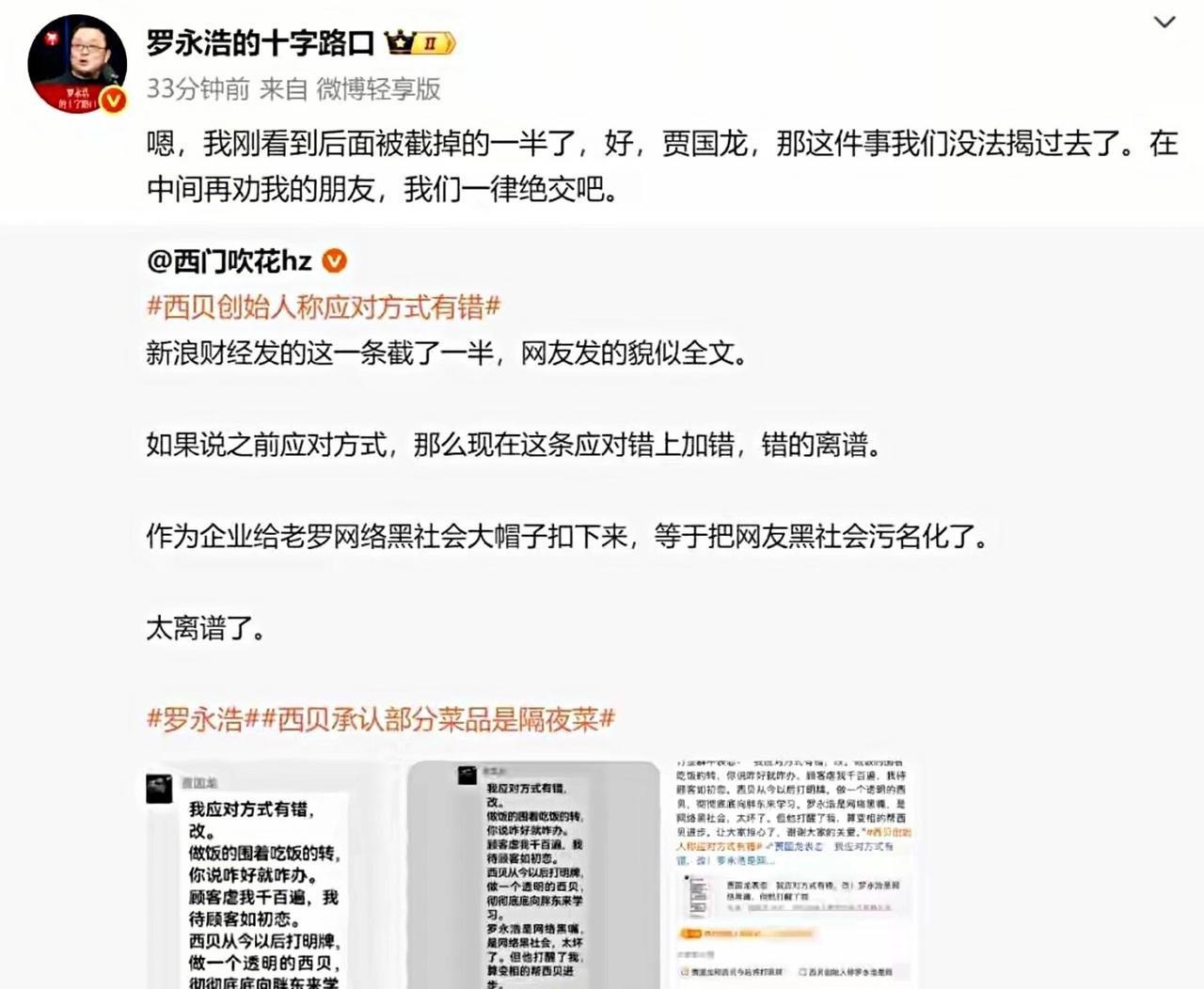 罗永浩本身都要休战了,贾国龙一句“罗永浩是网络黑嘴”,彻底把前者惹怒了:谁在劝我就拉黑! 现在看来,西贝的老板情商不高,咱就说一开始关于预热菜的争议,他们做的菜到底是不是预制菜,他心里应该比谁都清楚,但还是嘴硬,拿国标说事! 问题是,他们的菜是卖给消费者吃的,而不是国标,就算他坚称符合国标,按照国标就不是预制菜,但消费者不买账呀!毕竟谁愿意去他那里吃保质期能达到两年的西兰花? 冻了一年多的羊腿,鸡汤都是拿出来的冷冻品,然后加水重新熬制! 因此,按照贾总的逻辑,前面的半成品是从中央空调加工那不算数,只要最后在厨房里再经过煎炒烹炸或者加热等等,那就算是在厨房现炒的… 无论是消费者还是罗永浩,可能犟不过贾总,但消费者有选择的权利呀! 既然贾总坚称按照国标规则,就不是预制菜,那消费者只有冷笑一声:就让您的菜让国标去吃吧! 就如罗永浩说的,他不是抵制预制菜,而是希望餐厅能明确哪道菜是预制品,也希望卖的是预制菜,但价格别是五星级别的价格!