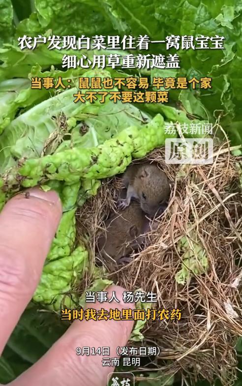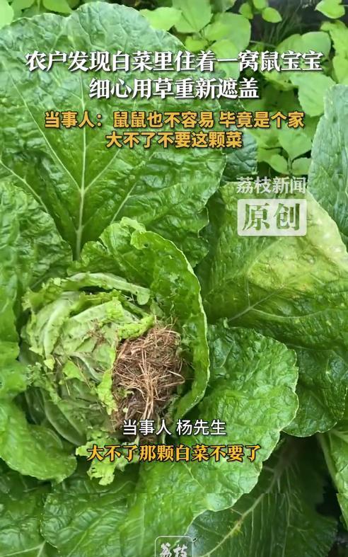 不知道大家还记不记得“四害”,在上个世纪,这四种动物那可是人人喊打,即使放到现在,老鼠依然被视为“眼中钉”,被发现了免不了被打死,没想到,如今竟然有人好心到放过老鼠。 这天,杨先生去菜地里打农药,由于白菜还有十来天就要上市了,所以这段时间害虫会比较多,他仔细喷洒着每一棵白菜。 忽然,杨先生看到一棵白菜中有堆枯草,感觉不像是风吹过来的,这瞬间引起了他的好奇。 杨先生表示,反正白菜快收了,到时候老鼠要是还没搬家,就将这棵白菜留给它们,对自己而言也没啥太大损失。 网友看后不淡定了,现在只是一窝小老鼠,等它们长大后就不知道是多少窝老鼠了,不趁着老鼠还小赶尽杀绝,非要等它们长大了祸害菜地才开心吗? 信息来源:《农户发现白菜里住着一窝鼠宝宝细心用草重新遮盖当事人:鼠鼠也不容易 毕竟是个家大不了不要这颗菜》荔枝新闻