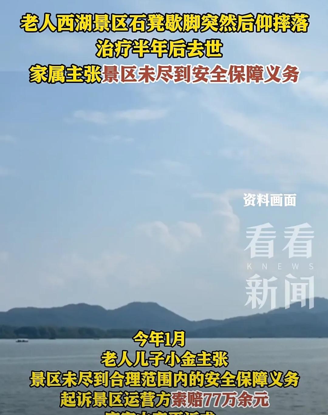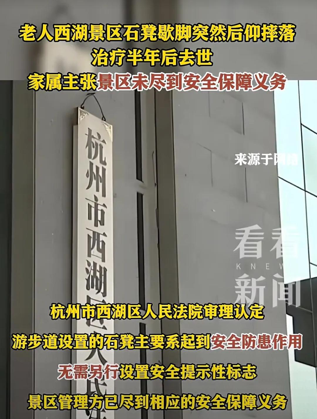 杭州,一老人随家人一行七人一起游西湖,到了一个景点,家人去买票,老人坐在旁边石凳上歇脚,突然意外发生,老人头后仰摔落在地上,送医治疗半年后去世,家属认定景区没尽到安全义务,石凳没靠背,故一纸诉状将景区告上法庭,索赔77万,法院判决大快人心! 老人70多岁了,2024年3月24日,老人和家人一起游西湖,家人去买票,老人走累了就去旁边一石凳上坐着休息,石凳高度约40厘米,没有靠背,不知怎的,老人突然就后仰摔倒了,保安3分钟内赶到,将老人送医。 可老人还是没挺过去,在同年11月8日,因呼吸衰竭离世。 老人离世后,家属悲痛万分,一纸诉状将景区告上法庭,一开始索赔77万元,后来庭审时改成28万元。 家属认为,景区石凳高度低又没靠背,后面还没防护措施,存在安全隐患;且景区没设安全警示标志,没有尽到安全保障义务,所以景区得赔偿医疗费、死亡赔偿金、精神抚慰金等。 但景区可不这么认为,他们觉得自己没责任。事发区域是停车场到景区的过渡通道,不是核心游览区,石凳本身就是防护设施的一部分;河道边有护栏,能起到安全警示作用;老人摔倒可能是因为当天阳光太强烈,有点眩晕,这属于意外事件;再说了,老人摔倒后,景区已经及时施救,家属没陪在老人身边,没尽到看护责任。 最后,法院站在了景区一边,判决景区没责任,驳回老人家属的全部诉讼请求,家属一分钱好处赔偿没捞到。 看到法院的判决,网友拍手称快,法院坚决不和稀泥,老人不幸离世虽然令人悲伤,但是作为老人家属,不能无底线无原则的要求景区赔偿。 俗话说“有理走遍天下,无理寸步难行”,现在人们的法律意识普遍提高,当事人依法维护自身的合法权益无可厚非,但不能一出事推卸责任找别人的麻烦。 景区不是保险箱,不可能把每个角落都做到绝对安全;家属自己没有尽到看护责任,不能把老人的安危都推给景区。 这次法院不偏袒任何一方,依据事实和证据判决,让我们看到了法律的公正 ,支持法院! 信息来源:看看新闻
