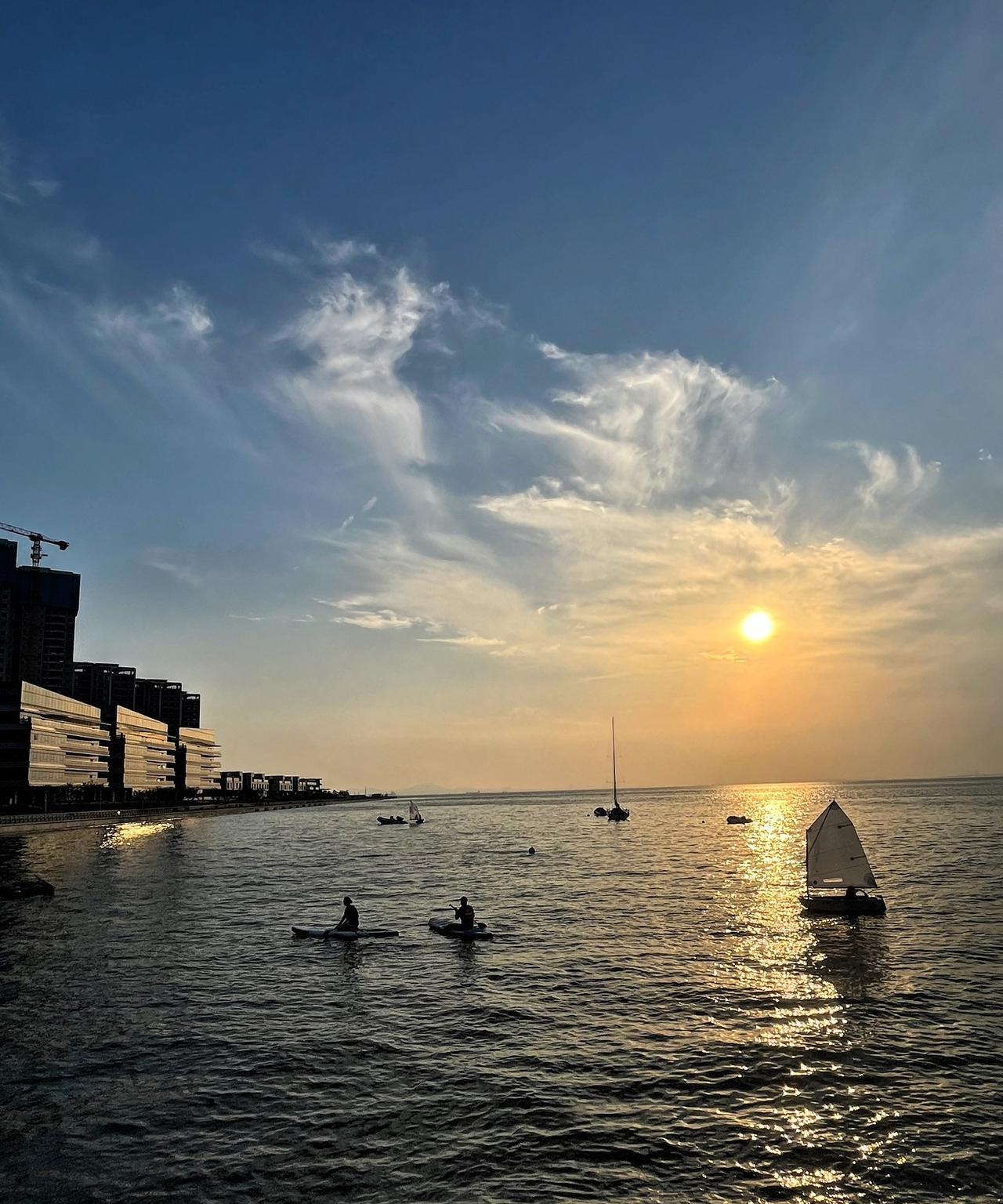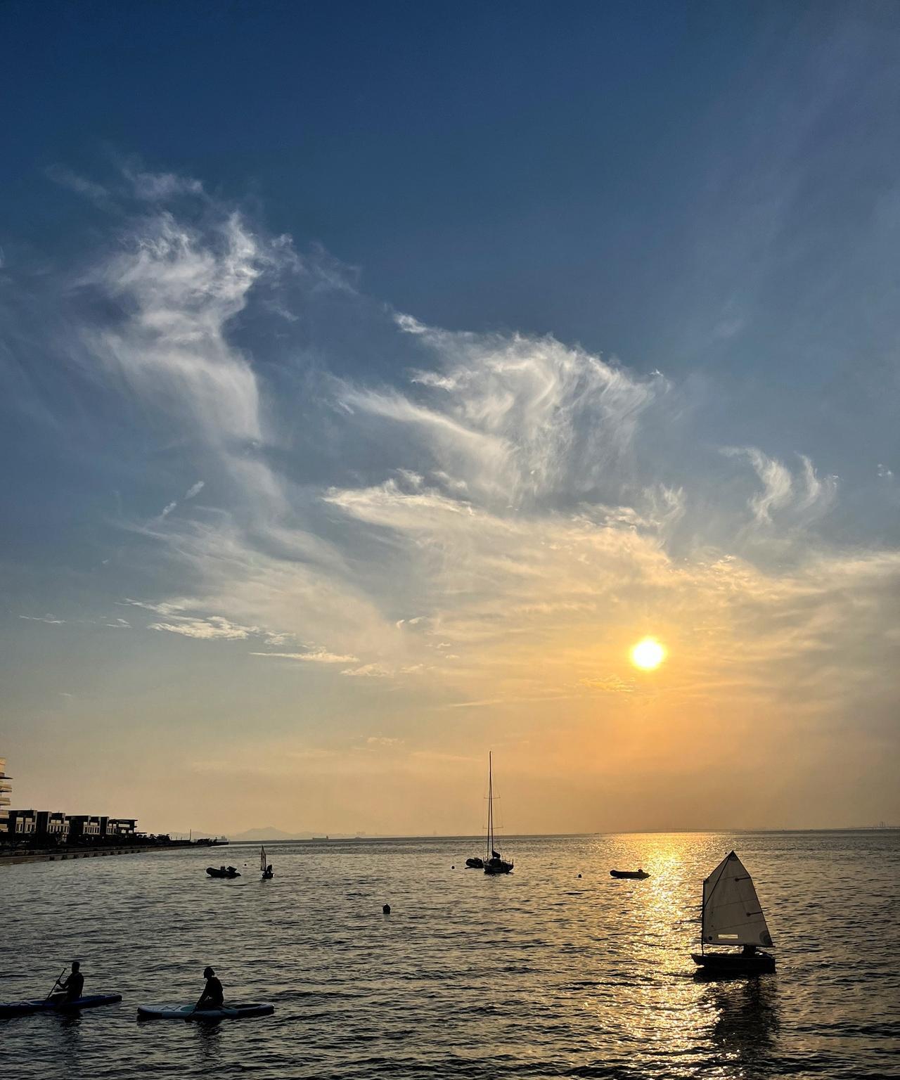 早秋,太阳即将落下时,橙红、粉紫的霞光铺满天空,将海面染成粼粼金波。 当太阳正落,天空呈现出迷人的低色温,使海面呈现出红色,而天空则是蓝色,天空变得通透,只有大浪翻滚时才会变得朦胧。 太阳落下之后,人多时会使整个天空呈现出红色,而云少时会出现粉色或紫色的天空,这些色彩都倒映在海面上,让海面也变得五彩斑斓。 #秋日生活打卡季#