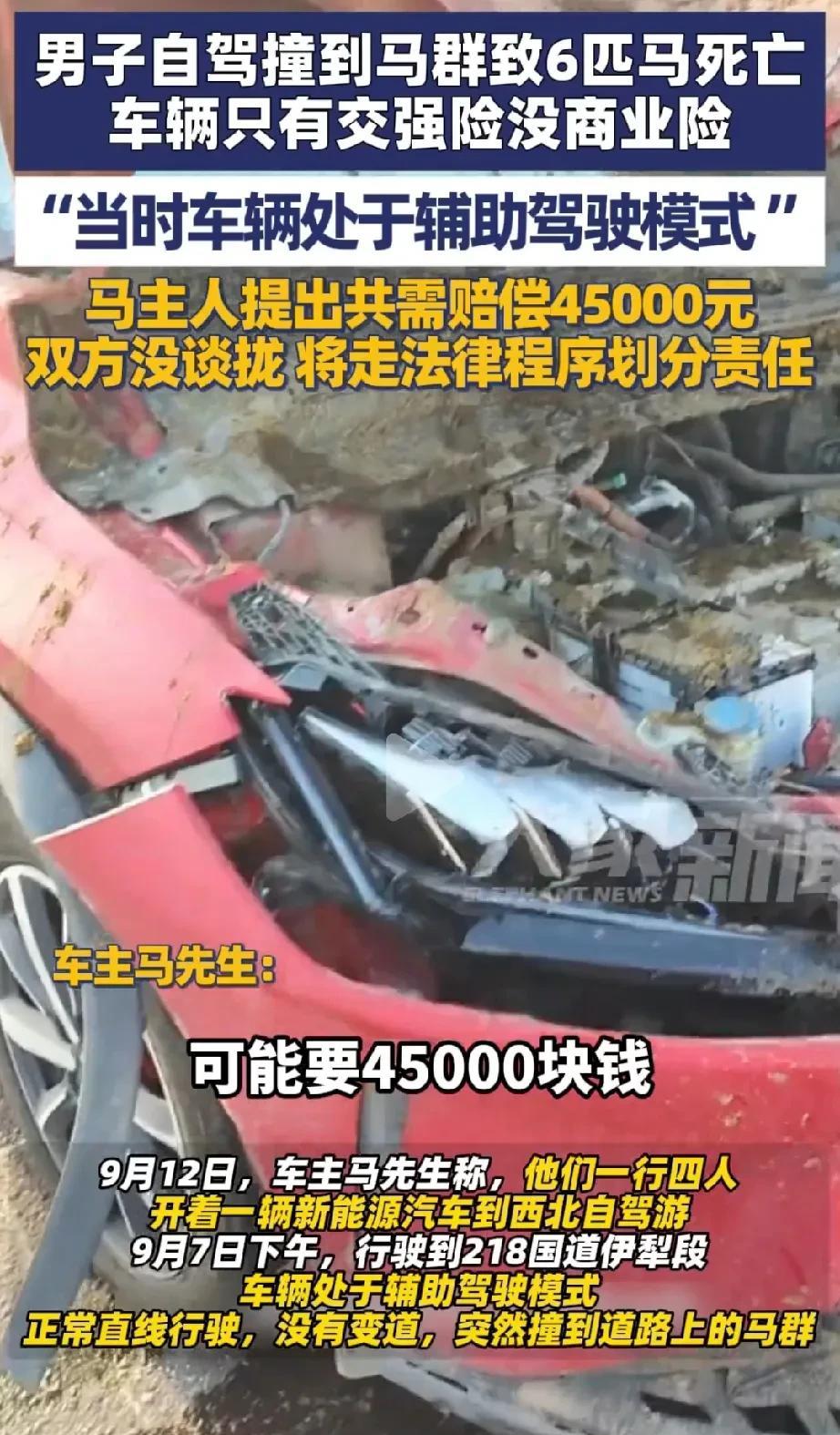 撞死6匹马要赔45000块钱多不多?近日,一男子到西北自驾游,在218国道伊利段,撞死了6匹马,马主人提出要求赔偿45000块钱。 当时,该男子驾驶的汽车处于辅助智能驾驶状态,直线行驶,突然撞到前方的马群。 据该男子讲,他的汽车只有交强险,没有商业险,马主人提出要45000块钱的赔偿,而他的汽车车损比较严重,修下来估计也要四五万块钱。 而该肇事男子称,他是正常行驶在国道上,而马群占据大幅的路面,马主人也应该承担一定的负责。 因此,双方没有就此谈拢,可能将要走法律程序来解决此事,造成男子也称,如果法律判决他承担多少责任的话,自己绝不逃避。 @猿方有看法 就目前马的市场价格来看,6匹马,就按普通国产马市场价来算,按照每批1.5到3万,可能要10万左右的价格了。 如果是更名贵的稀有的品种,那么价值就更高了。 现在马的主人提出4.5万元的赔偿,应该也考虑到了自己所应该承担的一部分责任,毕竟当时马是在国道的路面上。 所以现在这个45000块钱是不是合适?既然没有谈拢,看来主要在于双方对于各自该承担责任的多少有争议。 那就让法律来判定,像这种在辅助智能驾驶情况下,路面上突然出现马群,导致交通事故,说造成的损失,双方究竟应该各自承担多少比例? 各位网友,觉得这个45000块钱合不合适呢?这种情况的交通事故,各自的责任比例多少合适呢?