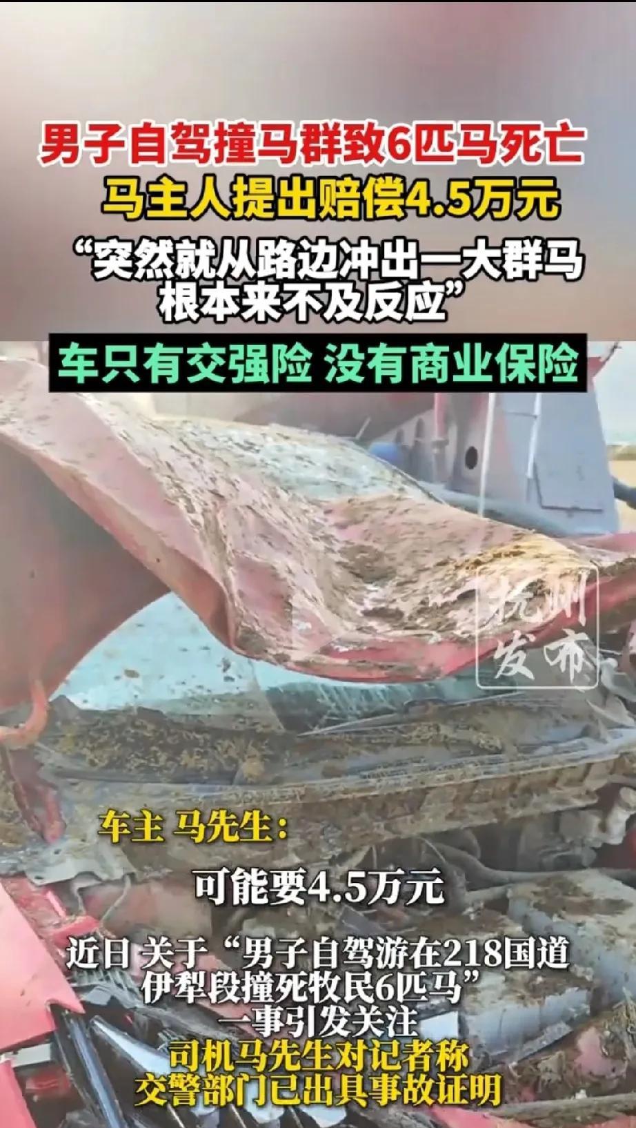 撞死6匹马要赔45000块钱多不多?近日,一男子到西北自驾游,在218国道伊利段
