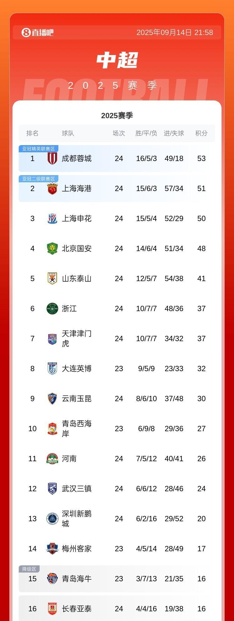 中超天王山决战!9.21双雄厮杀定冠军归属,成都黑马逆袭申花崩盘?